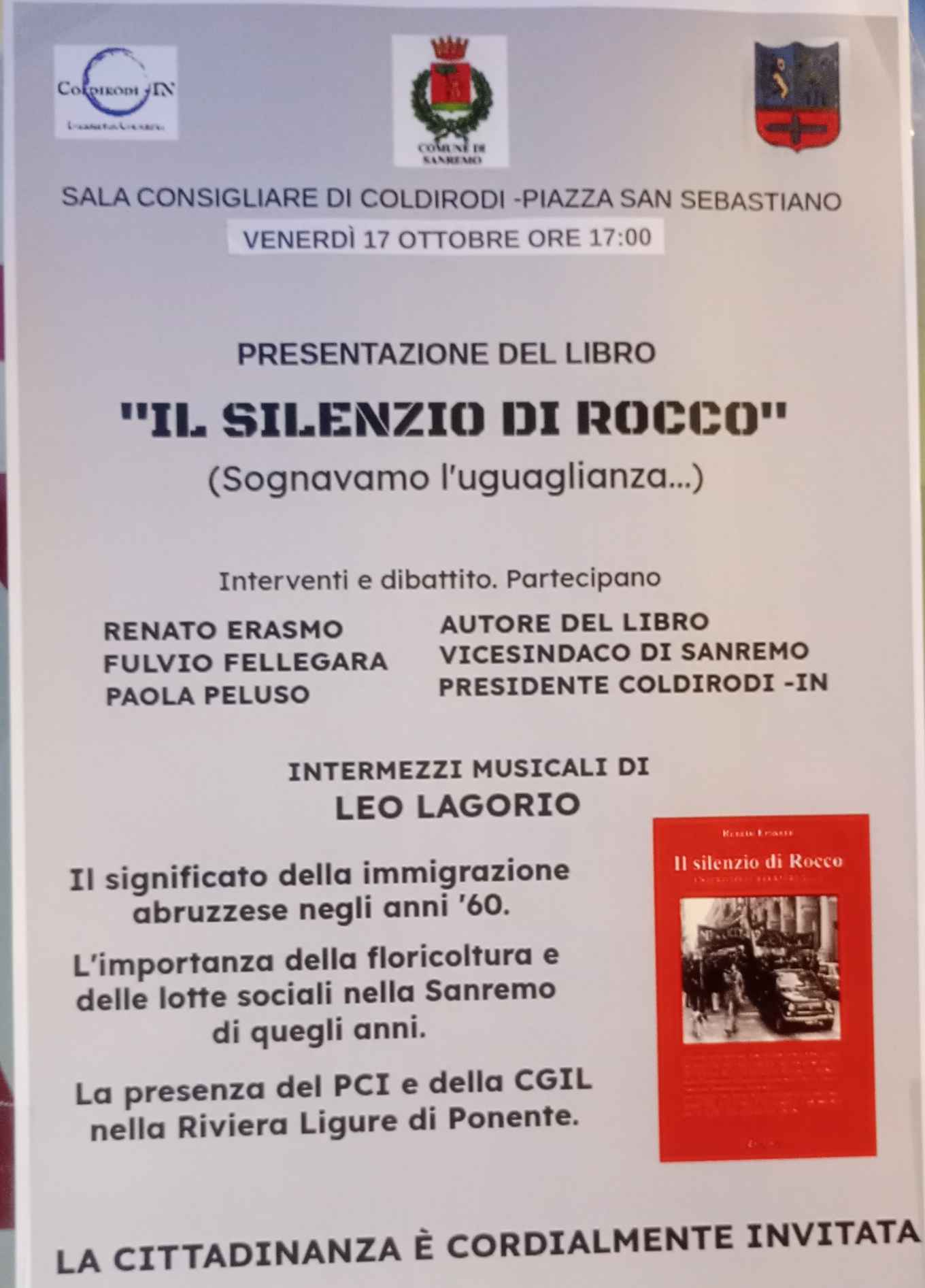 “Il silenzio di Rocco” – sottotitolo “Sognavamo l’uguaglianza…” – è il libro di Renato Erasmo che sarĂ presentato questo pomeriggio, alle ore 17:00, presso l’ex sala consiliare di Coldirodi.