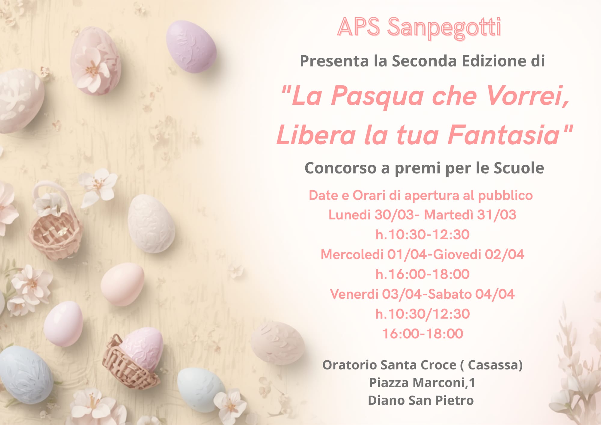 Torna con la seconda edizione il concorso a premi per le scuole ‘La Pasqua che vorrei, libera la tua fantasia’, promosso dall’APS Sanpegotti in occasione delle festività pasquali. Un’iniziativa che mette al centro la creatività dei più piccoli e rafforza il legame tra scuola, territorio e famiglie.