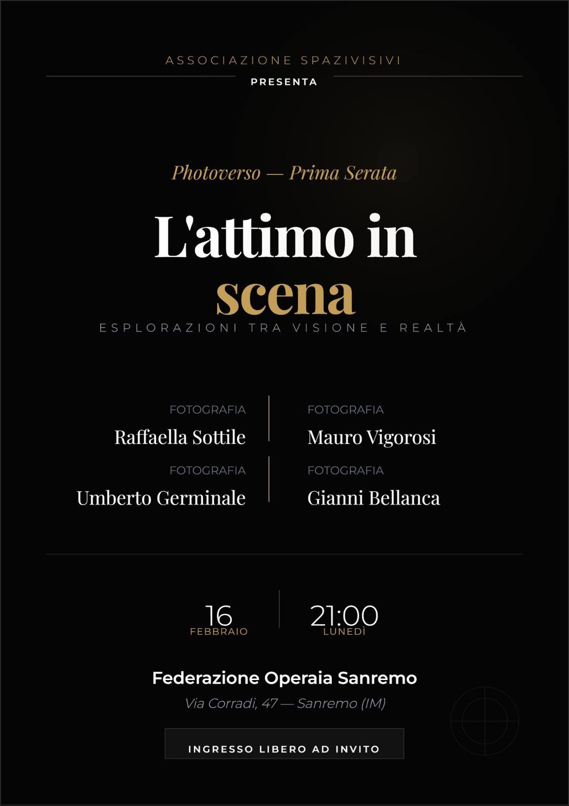 Per questo debutto Spazivisivi ha scelto il tema che qui a Sanremo è di casa tutto l’anno: lo spettacolo. Da qui il titolo della serata L’attimo in scena, che riunisce quattro sguardi d’eccezione, autori capaci di interpretare il “Photoverso” attraverso stili e percorsi profondamente diversi: