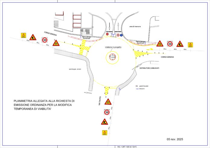 Si comunica che, a partire da lunedì 24 novembre alle ore 19, inizieranno i lavori di posa della nuova rotatoria provvisoria all’intersezione tra corso Genova e via Tacito, in corrispondenza dell’accesso al costruendo parcheggio sopra corso Genova, al fine di garantire, una volta ultimati i lavori, l’accesso al parcheggio stesso. In entrambe le vie sarà istituito, in prossimità della rotatoria, un limite di velocità pari a 30 km/h.