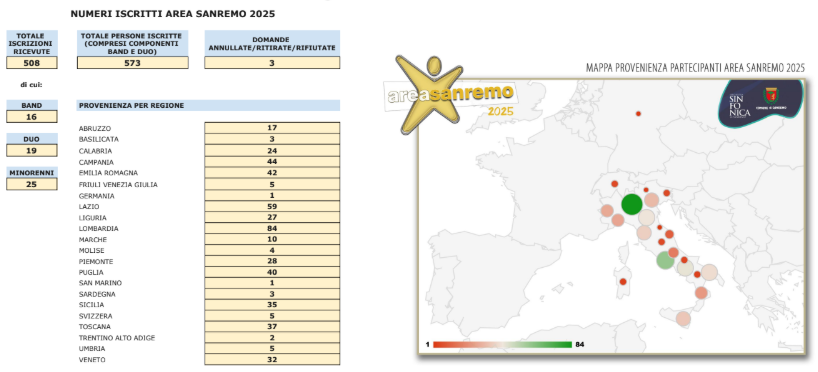 “Il grande numero di iscrizioni ad Area Sanremo è la conferma del lavoro portato avanti in questi mesi per il quale ringrazio la Fondazione Orchestra Sinfonica”, commenta l’assessore al Turismo, Alessandro Sindoni. “Un lavoro che rivela l’appeal crescente di un’iniziativa che continua ad attirare giovani artisti da tutta Italia, affascinati dalla possibilità di mettersi in gioco in una città che della musica ha fatto la propria identità. Area Sanremo rappresenta un volano straordinario anche per il nostro turismo: ogni edizione porta nuovi visitatori, crea movimento, genera entusiasmo e contribuisce a rafforzare l’immagine della nostra città come luogo di creatività, talento e cultura. Ancora una volta Sanremo si conferma punto di riferimento per chi ama la musica”.