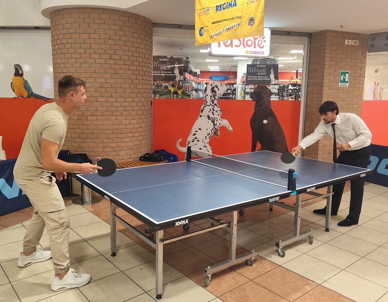 La postazione del Ping-Pong, allestita nel piazzale centrale del Centro Commerciale di Via Privata Roggero, ha visto la partecipazione di importanti autoritĂ  locali: il Vice-Sindaco di Taggia, Espedito Longobardi, il Sindaco di S. Lorenzo al Mare, Enzo Mazzarese, la Direttrice dello Shopville, Arianna Bellastro, e il pioniere del Tennistavolo rivierasco, Matteo Anfossi, che hanno tutti provato con entusiasmo a impugnare la racchetta.