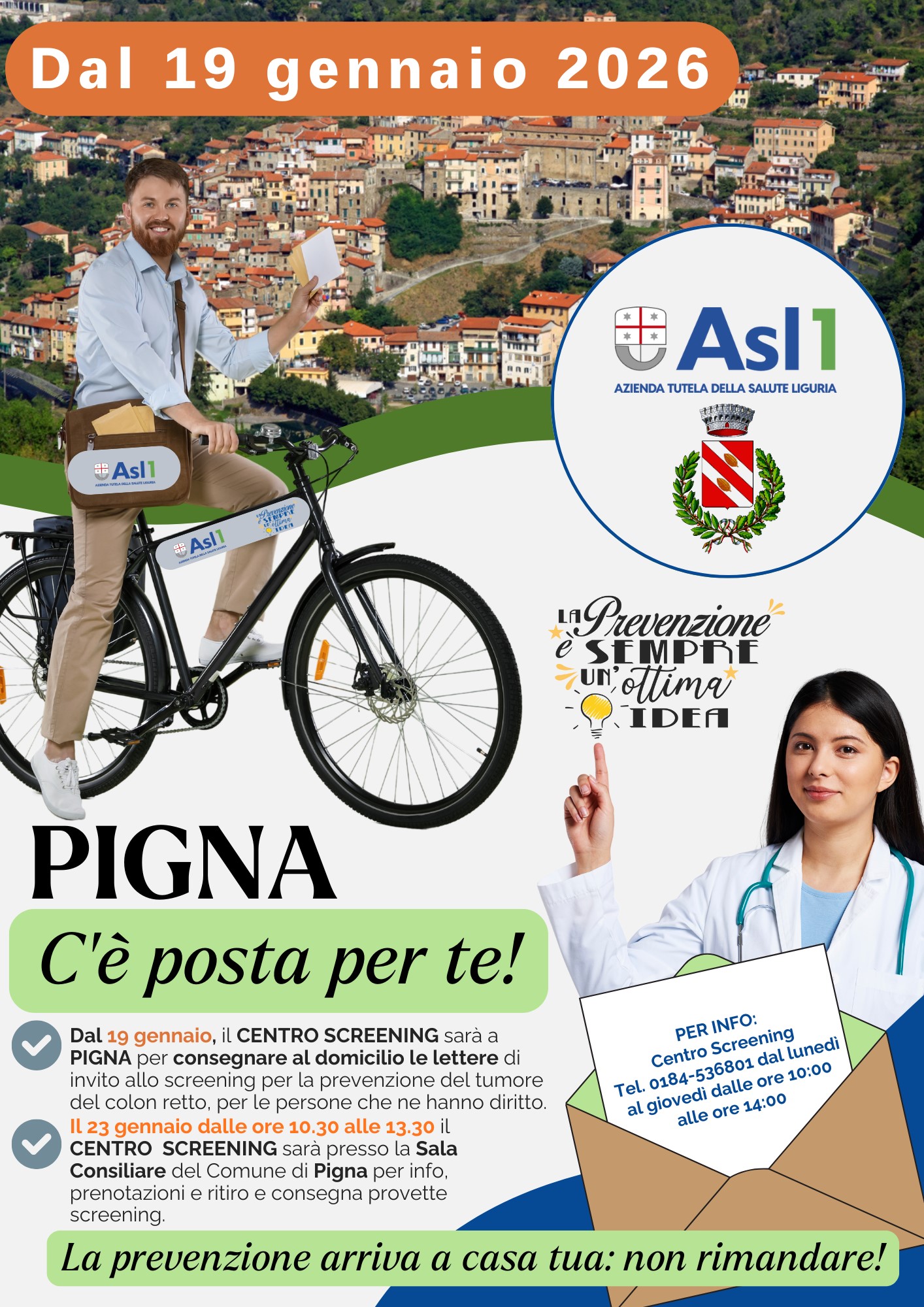 Ripartono gli appuntamenti dedicati alla prevenzione sul territorio. Nella settimana dal 19 al 23 gennaio, operatori della Asl1, afferenti al Dipartimento di Prevenzione, saranno a Pigna per informare, sensibilizzare e facilitare la cittadinanza nell’adesione ai programmi gratuiti di screening.