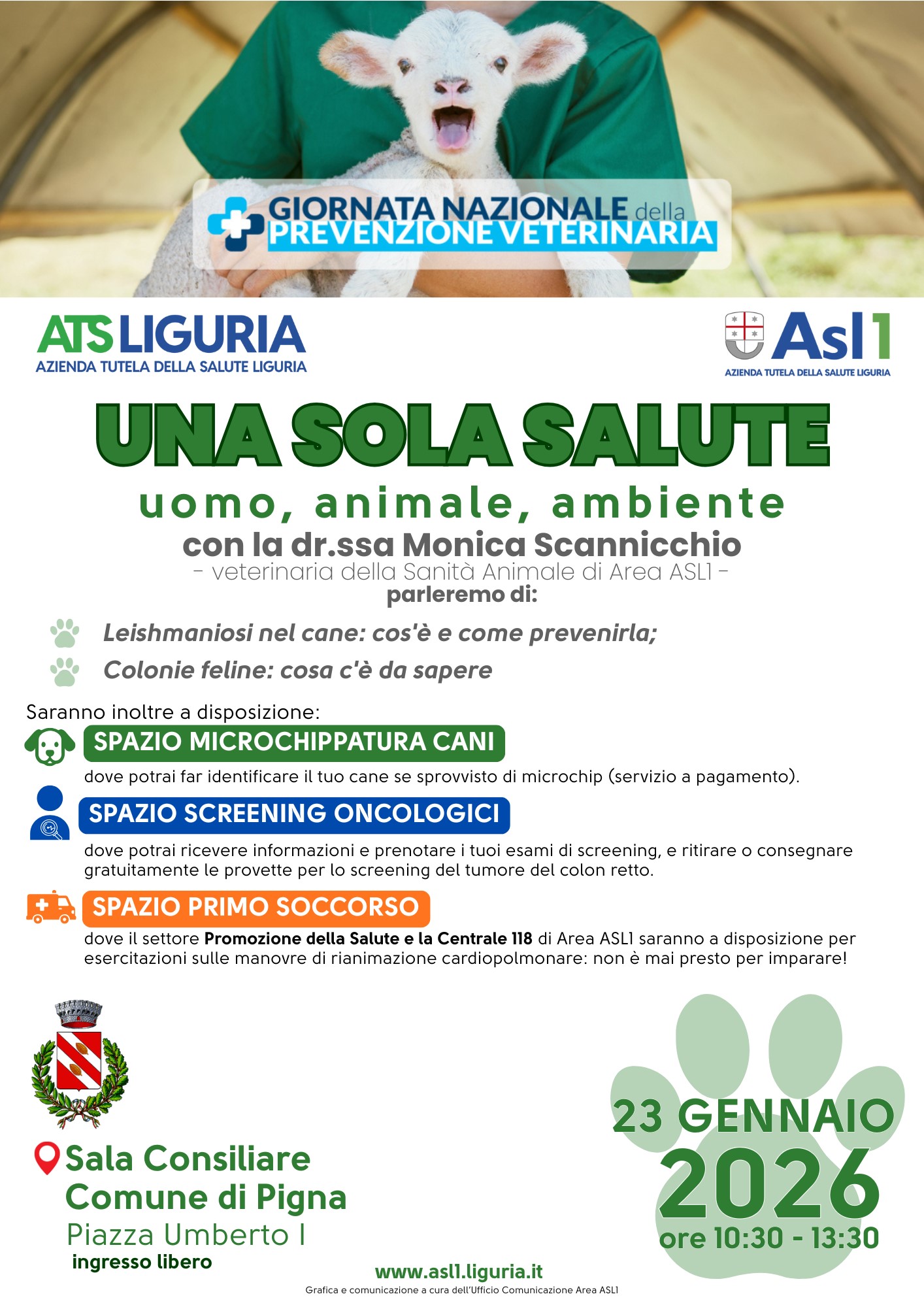 La settimana si concluderà venerdì 23 gennaio, con una doppia iniziativa. Dalle 10.30 alle 13.30, presso i locali della scuola secondaria di primo grado di Pigna, i veterinari della Asl incontreranno studenti e studentesse per spiegare come interagire correttamente con gli animali. Nello stesso orario, insieme al personale sanitario della Promozione della Salute e del 118, verranno illustrate e praticate le manovre di primo soccorso e di rianimazione cardiopolmonare.