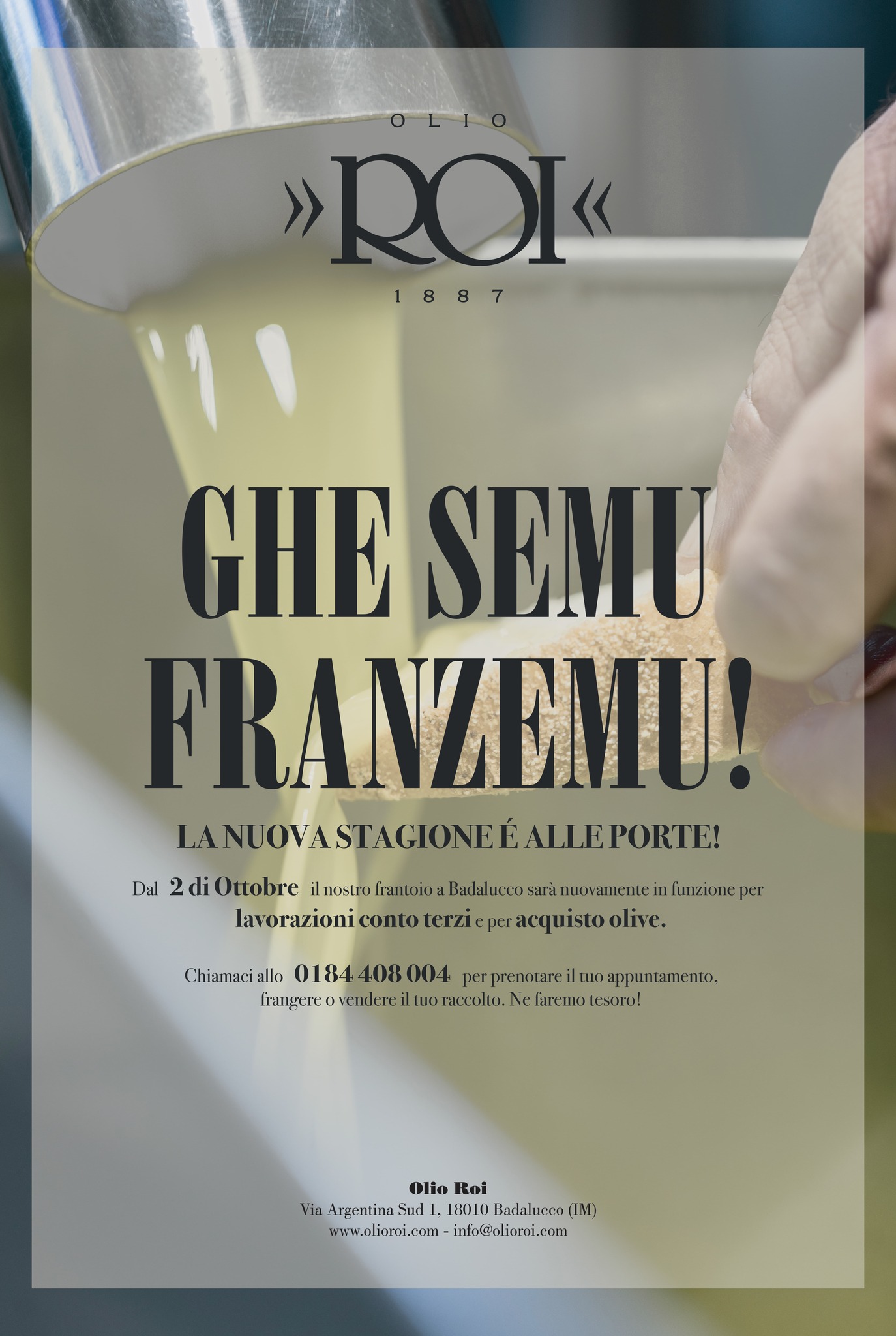 Ghe semu, franzemu! Tutto è pronto per una nuova raccolta“. Con queste parole Paolo e Franco Boeri annunciano l’inizio della stagione di frangitura al Frantoio Roi di Badalucco. Da domani, 2 ottobre, i macchinari torneranno in funzione, pronti ad accogliere sia chi porta le proprie olive per la molitura sia chi desidera venderle. Un appuntamento che segna, come ogni anno, l’apertura di un nuovo capitolo nella storia dell’olio taggiasco e della tradizione olivicola della Valle Argentina.