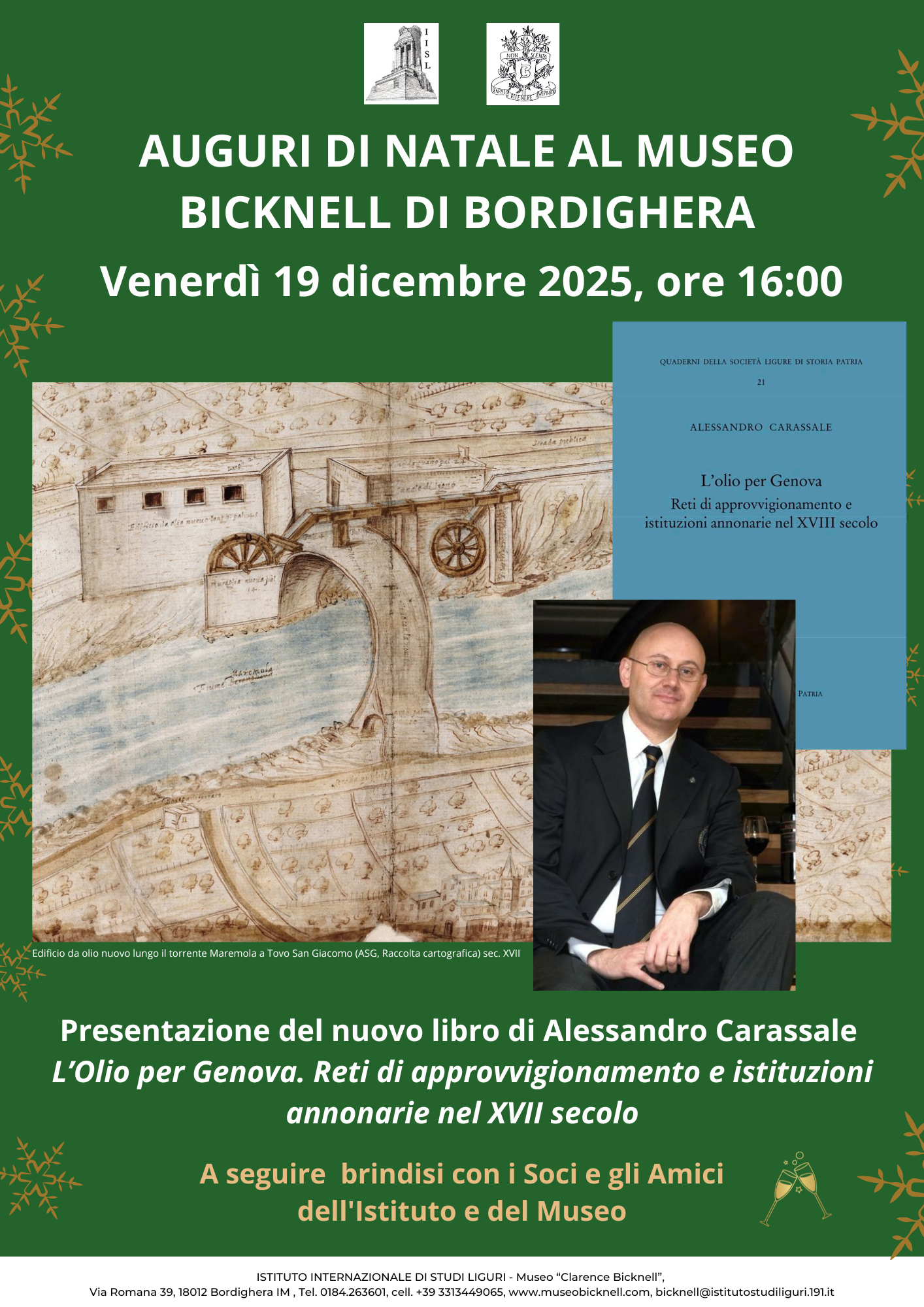 Al termine della presentazione seguirà un momento conviviale: un brindisi per scambiarsi gli auguri di buone feste insieme ai Soci e agli Amici dell’Istituto e del Museo alla presenza del presidente dell’Istituto Internazionale di Studi Liguri prof. Giovanni Mennella.