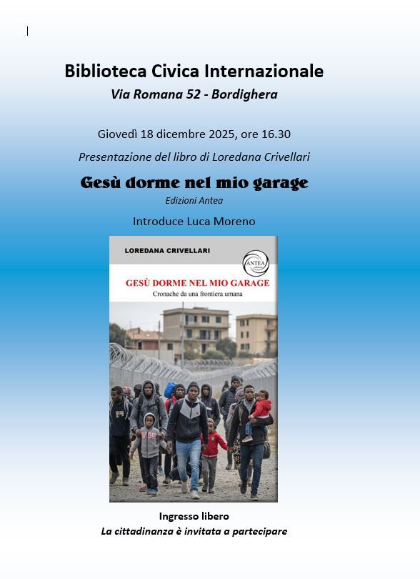 Giovedì 18 dicembre, alle 16.30, la Biblioteca Civica Internazionale di Bordighera ospita la presentazione del volume di Loredana Crivellari “Gesù dorme nel mio garage“, con la presentazione di Luca Moreno.