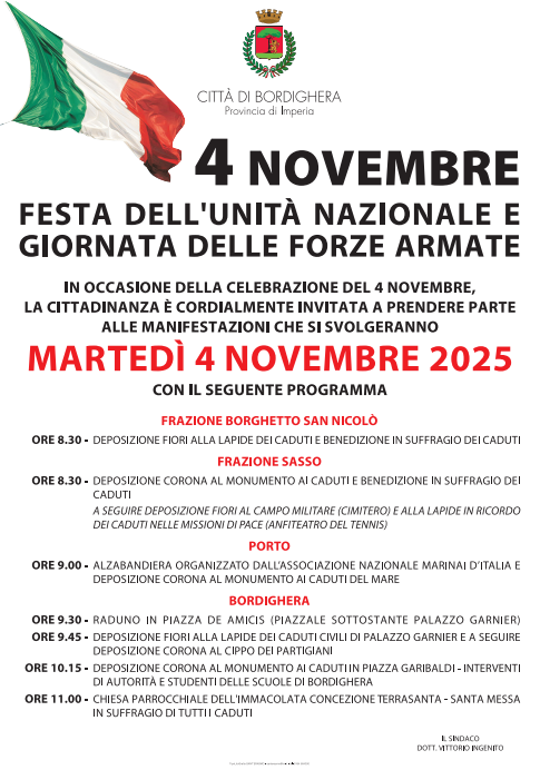 Il Comune di Bordighera rende noto il programma delle celebrazioni in occasione del 4 Novembre, Festa dell’Unità Nazionale e Giornata delle Forze Armate.