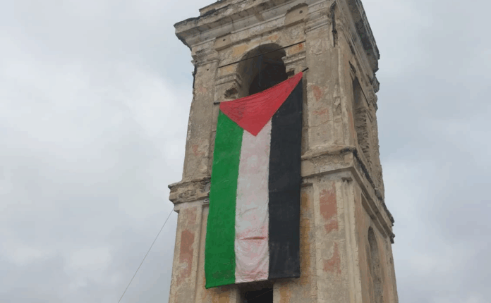 Per l’ultima serata del Festival di Sanremo 2026, la comunità di Bussana Vecchia ha deciso di appendere temporaneamente al campanile della chiesa di Sant’Egidio la bandiera della Palestina, per fare simbolicamente luce sul genocidio ancora in atto in Palestina.