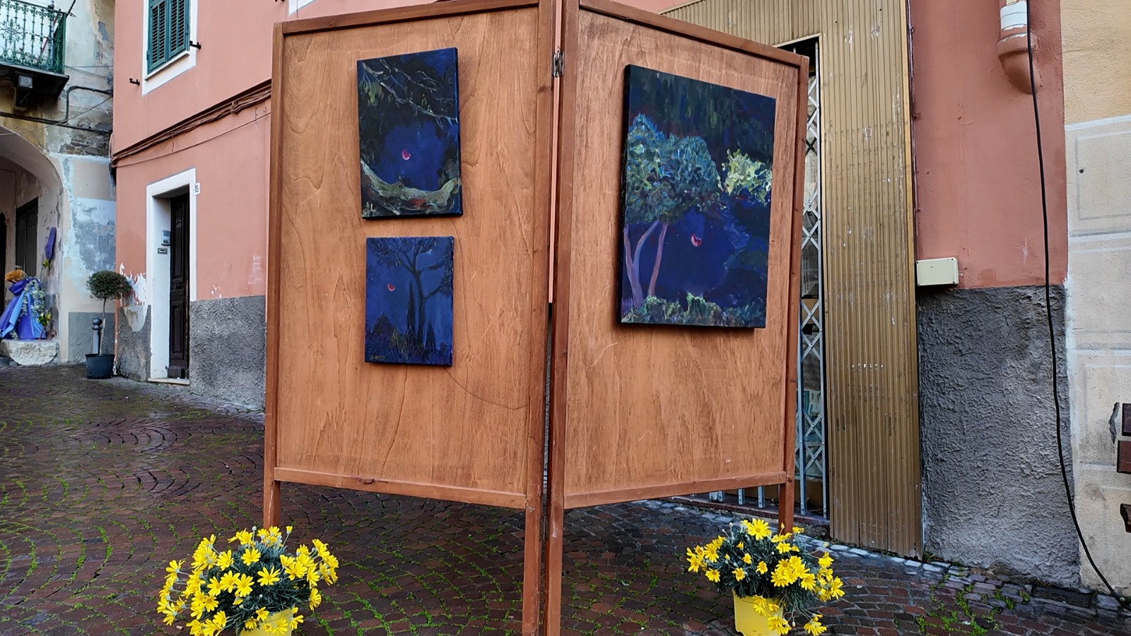 I quadri esposti raccontano paesaggi montani e scorci del fondovalle che caratterizza il territorio di Camporosso, ma non mancano nemmeno raffigurazioni di musicisti: “Li abbiamo messi proprio nei caruggi, perché oggi ci sarà anche una festa dedicata alla musica. Ci sarà in piazza un concorso musicale, esibizioni di ballo e si concluderà poi tutto nelle cantine”.