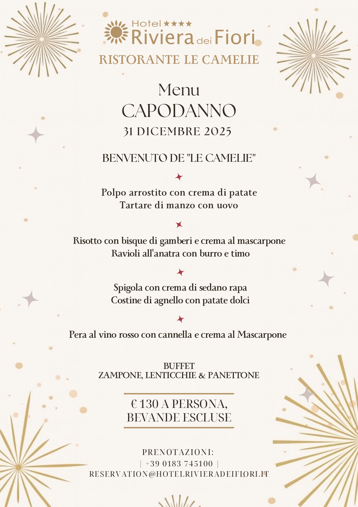 Tra sapori d’eccellenza, atmosfera esclusiva e il brindisi più emozionante dell’anno, l’Hotel Riviera dei Fiori invita a salutare il 2025 e dare il benvenuto al 2026 con stile, gusto e la bellezza senza tempo del mare.