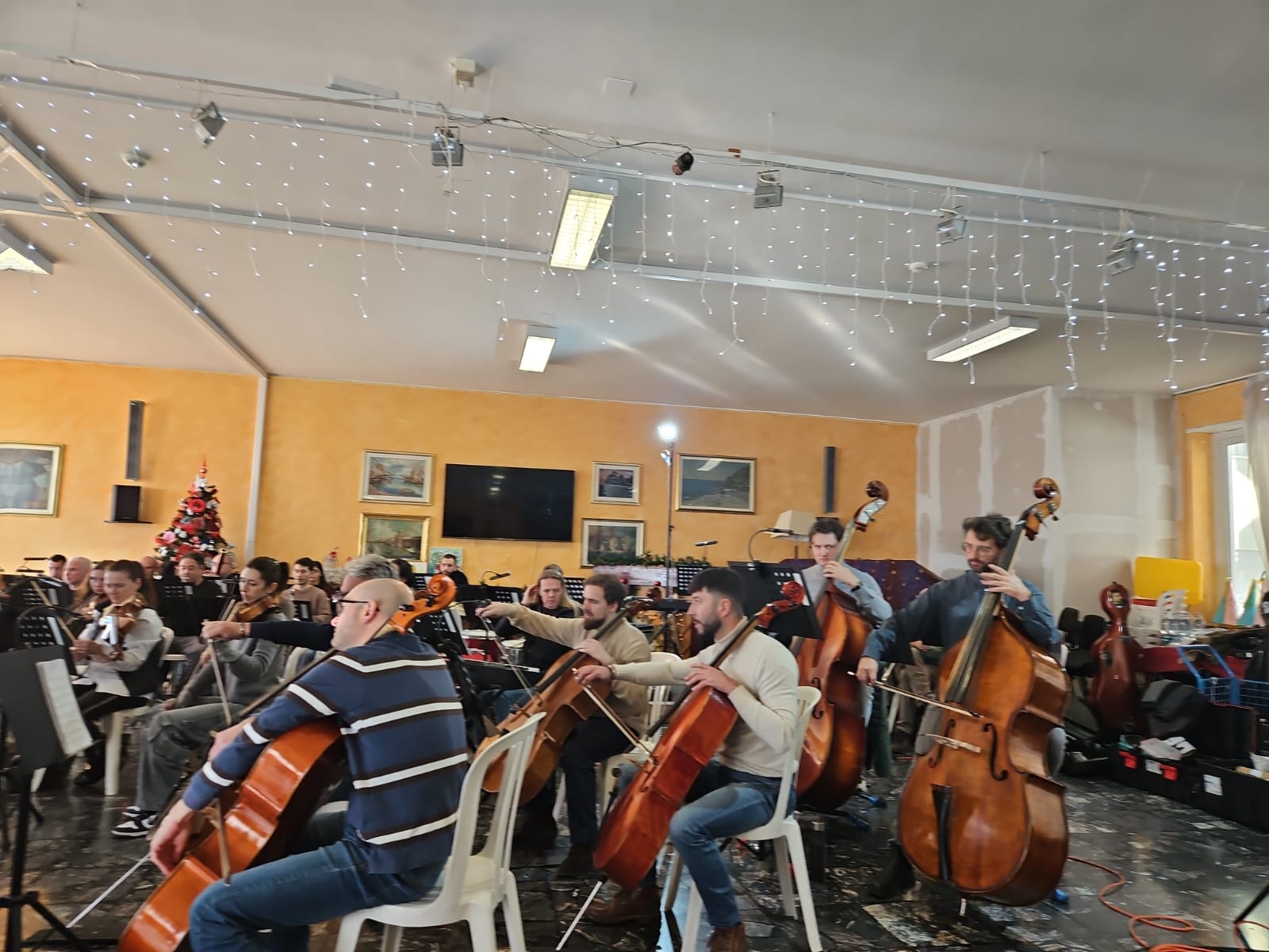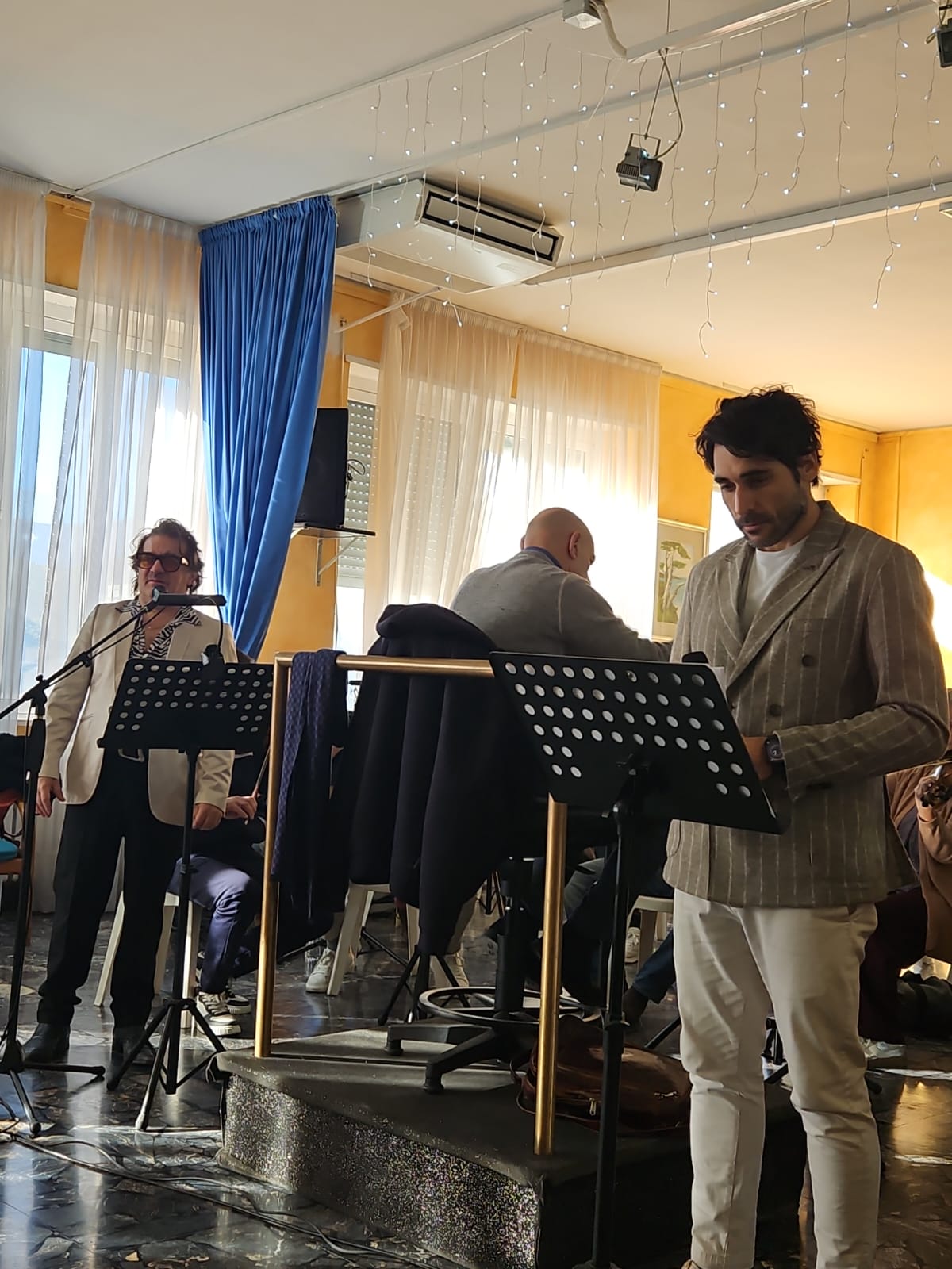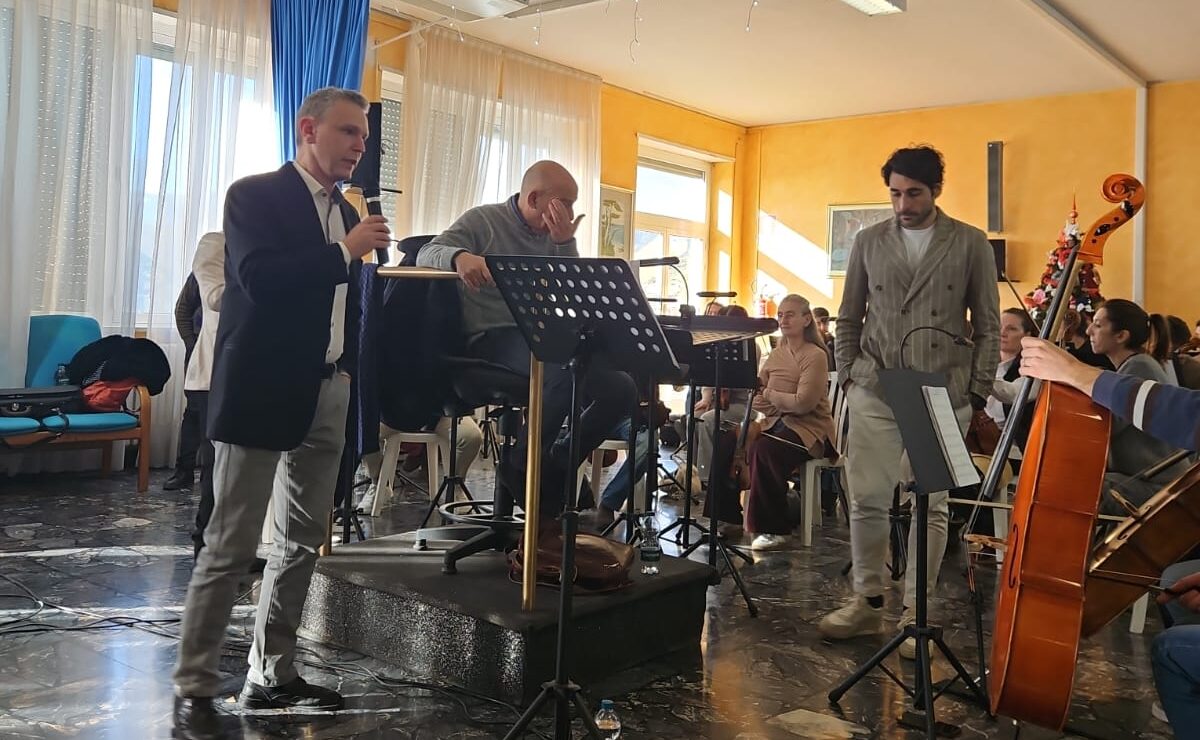 Gli ospiti e i loro famigliari hanno infatti assistito ad una prova aperta con tredici brani del repertorio di Modugno, tra i quali “Amara terra mia”, “Vecchio frac”, “Resta cu’ mme”, “Tu si ’na cosa grande”, “Meraviglioso” e l’indimenticabile “Nel blu dipinto di blu”. A dirigere l’Orchestra ù stato il maestro Giancarlo De Lorenzo. Lo spettacolo ù stato interpretato da Peppe Voltarelli, con testi scritti e recitati dall’attore Davide Mancini.