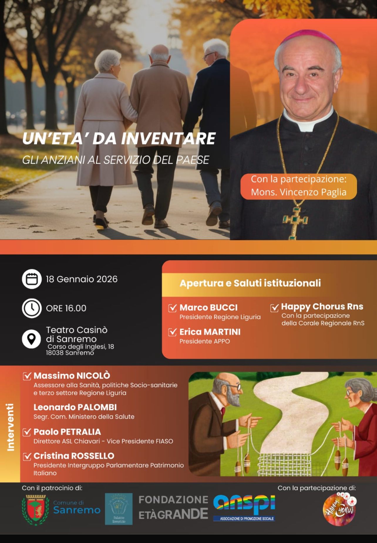 Si svolgerà domenica 18 gennaio, alle 16, al Teatro del Casinò di Sanremo, il convegno “Un’età da inventare. Gli anziani al servizio del Paese”, un appuntamento dedicato a ripensare il ruolo dell’età anziana nella società contemporanea.