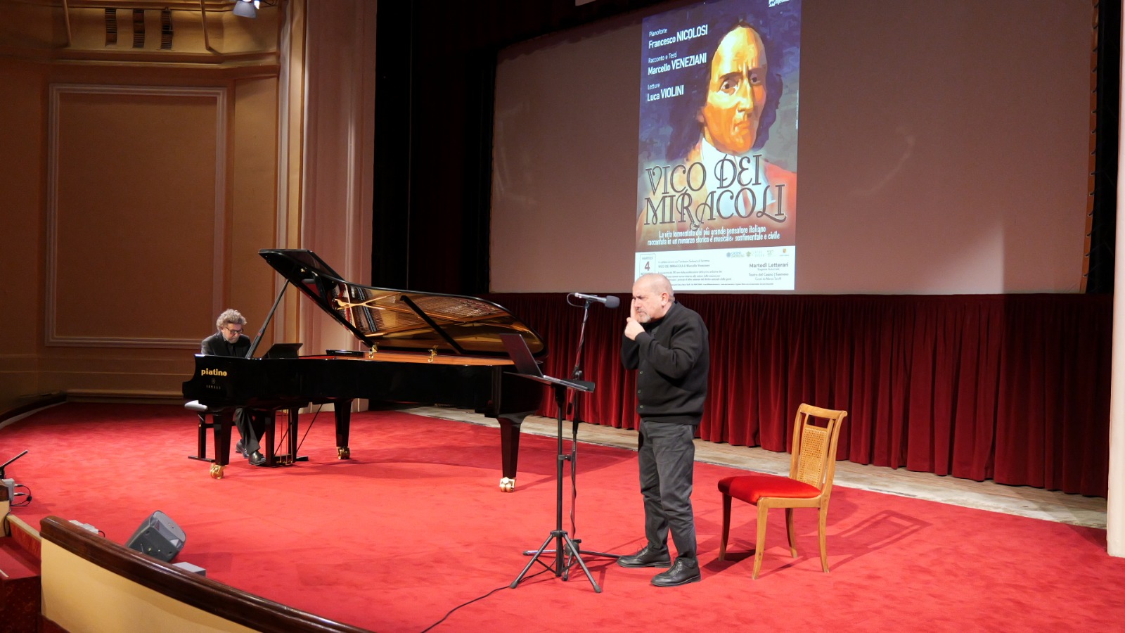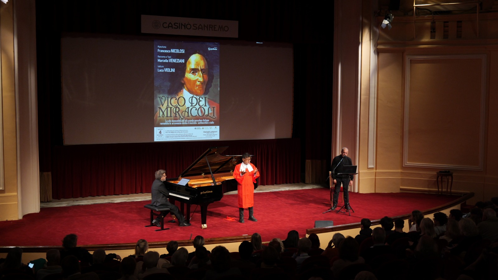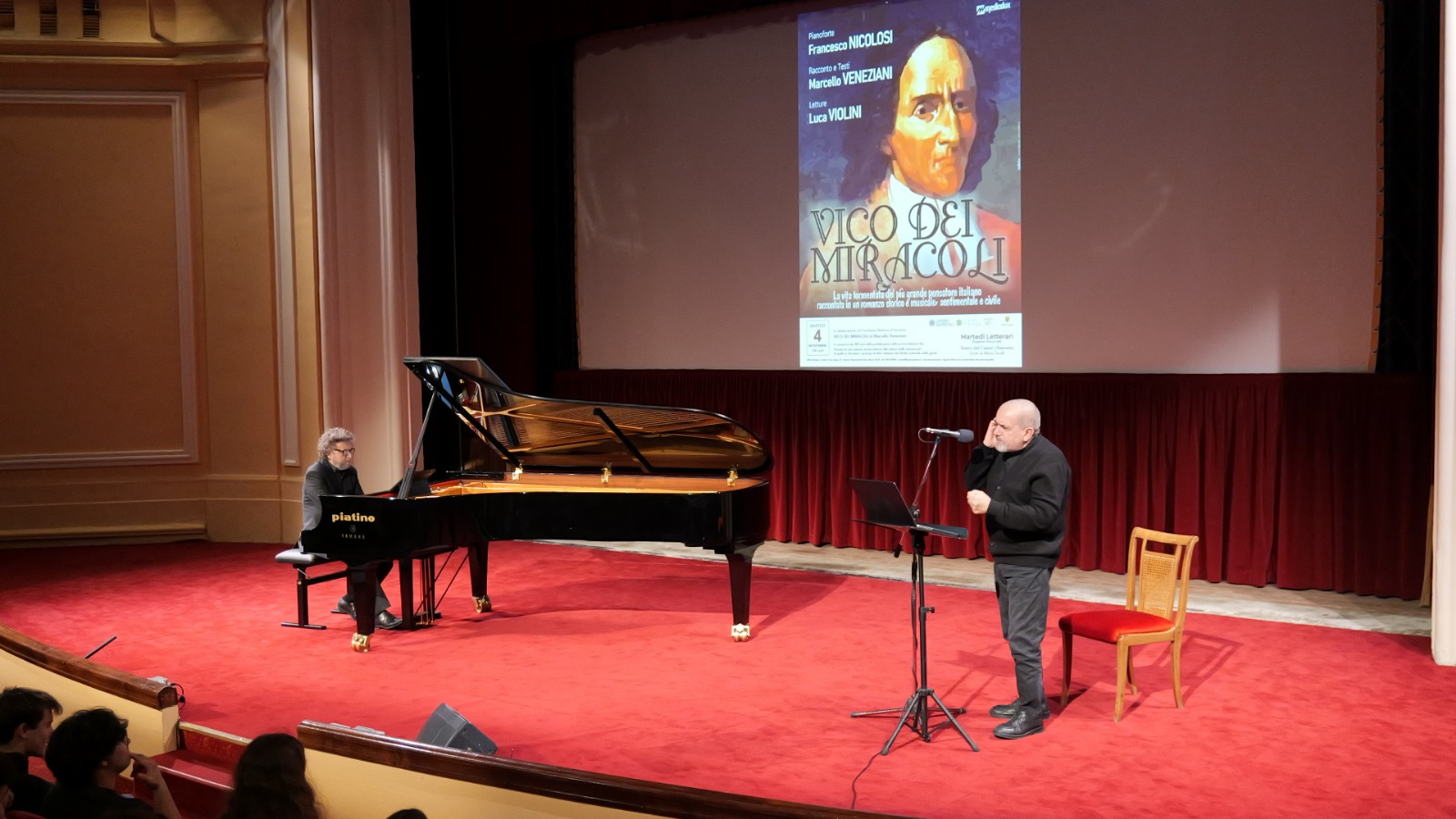 Un viaggio tra filosofia, mito e poesia. Così Marcello Veneziani, scrittore, saggista e filosofo, ha riportato in vita il genio di Giambattista Vico sul palco del Teatro del Casinò di Sanremo, nell’ambito dei Martedì Letterari. Accompagnato dal pianista Francesco Nicolosi e dalle letture teatrali di Luca Violini, Veneziani ha proposto uno spettacolo dando voce al suo ultimo libro, “Vico dei miracoli“.