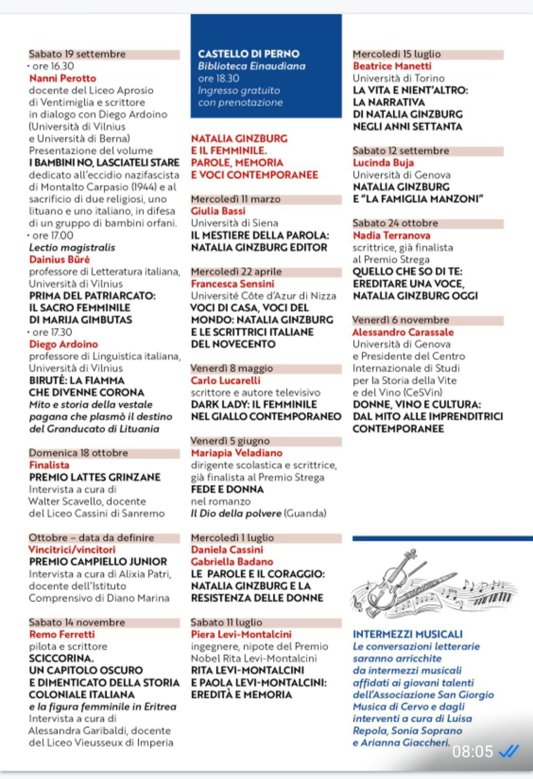 Il programma per l’intero anno, unirà i borghi di Cervo e Perno, nel Comune di Monforte d’Alba, in un articolato percorso dedicato alla letteratura, alla storia e alla cultura contemporanea. La rassegna nel 2026 propone un calendario di incontri con alcune tra le più autorevoli voci della cultura contemporanea da Massimo Recalcati a Nadia Terranova, da Tiziana Ferrario a Piera Levi- Montalcini, da Marta Stella a Carlo Lucarelli. Un progetto corale che attraversa il mito, il Novecento e il presente, da Medea a Natalia Ginzburg, con un’attenzione particolare alle storie di donne e alle storie di parole.