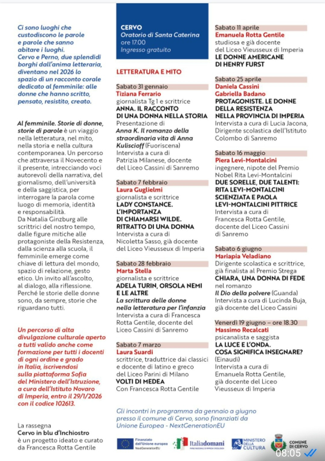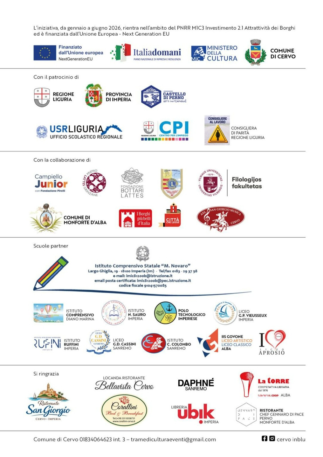 L’edizione 2026, dal titolo ‘Al femminile. Storie di donne, storie di parole’, è un progetto finanziato dall’Unione Europea, dal Ministero della Cultura e dal Comune di Cervo, con il patrocinio di Regione Liguria e Provincia di Imperia, e con la collaborazione di importanti enti culturali e accademici nazionali e internazionali. Di particolare rilievo è il patrocinio del Ministero dell’Istruzione e del Merito – Ufficio Scolastico Regionale per la Liguria. Il dirigente Alessandro Clavarino (Ufficio II della Direzione Generale) ha riconosciuto la rassegna come attività di formazione per i docenti, valutandone l’elevata valenza formativa e sociale. Il progetto si svolgerà dal 31 gennaio al 14 novembre 2026, nel corso dell’ anno scolastico 2025/2026 e 2026/2027.