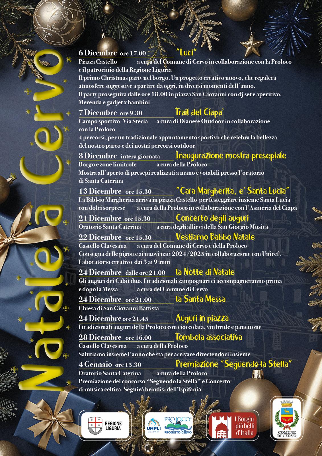 “Luci”, primo Christmas Party nel borgo, a cura del Comune di Cervo in collaborazione con la Pro Loco e con il patrocinio della Regione Liguria. A seguire, dalle ore 18, festa in piazza San Giovanni con dj set, aperitivo e merenda per i bambini.​