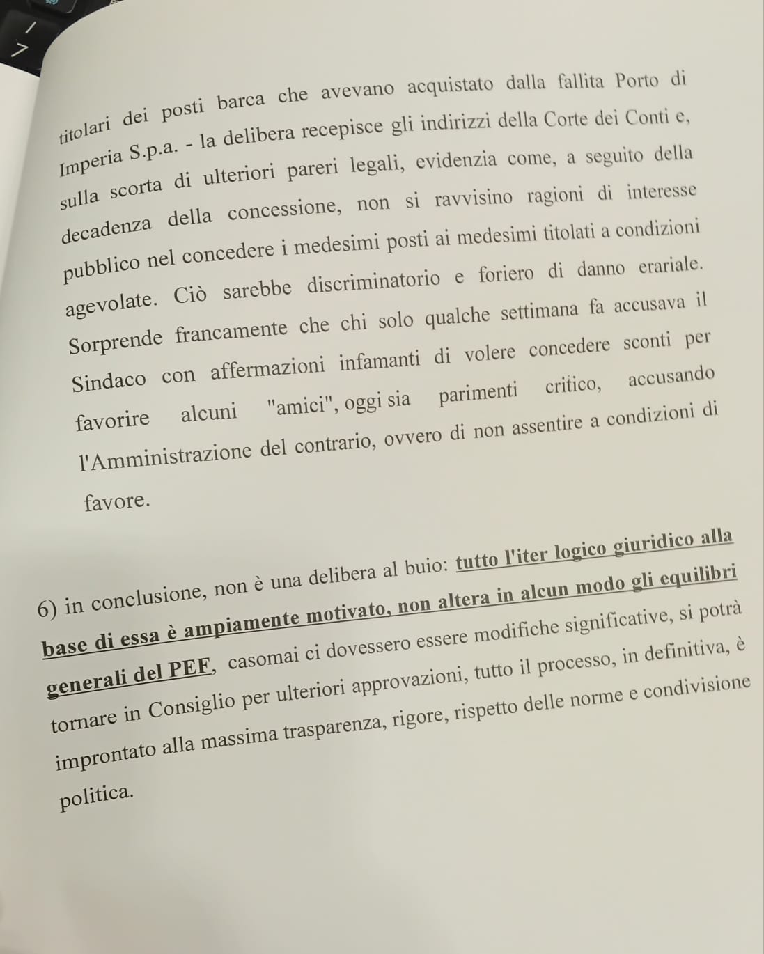“Vi siete attaccati al fatto che mancasse la nota di Marina di Imperia” dice rivolgendosi all’intera opposizione “che è una paginetta e non è un allegato necessario. È un semplice richiamo. Dire che bisogna rimandare perché manca una nota, francamente è poco serio”. Replica Sardi: “Era così poco necessaria che l’avete inserita nel portale del Comune dopo la nostra segnalazione”.