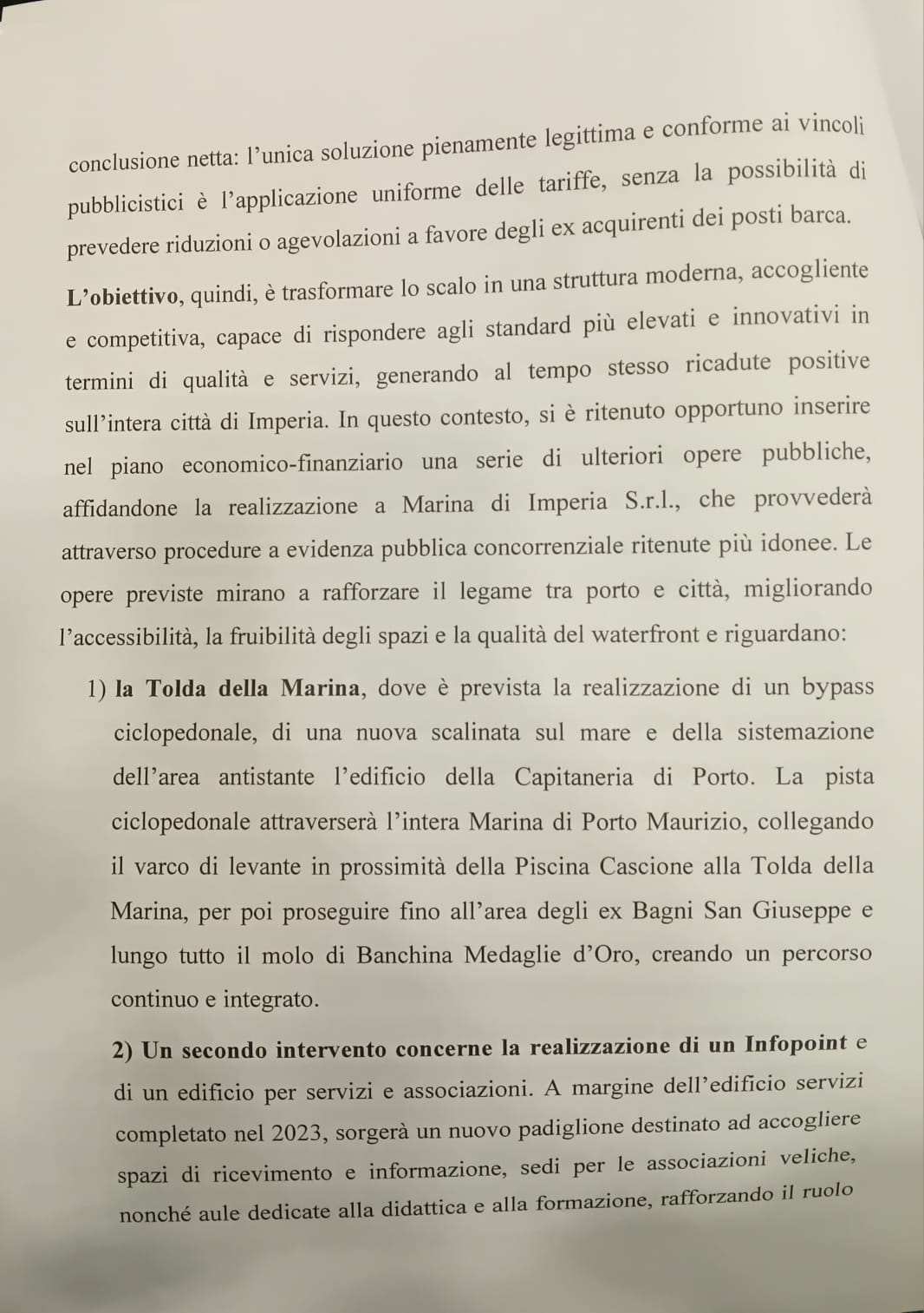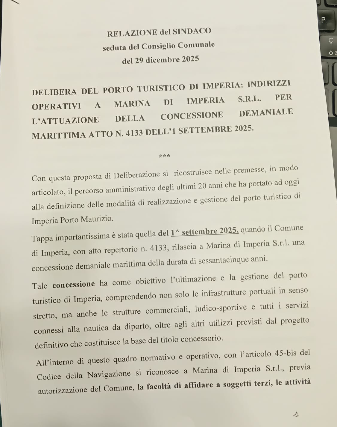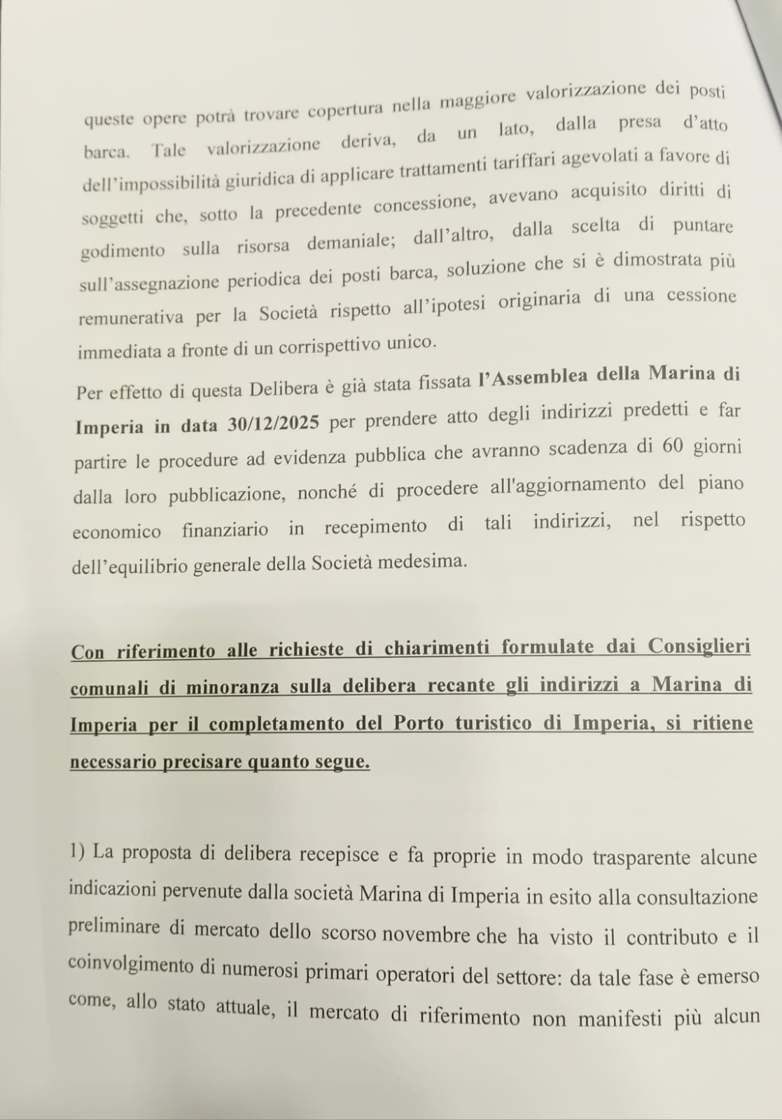 La delibera, ricostruisce il percorso amministrativo degli ultimi vent’anni che ha portato alla concessione alla odierna Marina di Imperia s.r.l., che ha ora l’obiettivo di completare e gestire il porto turistico di Porto Maurizio, includendo infrastrutture portuali, attività commerciali, sportive e servizi per la nautica da diporto.