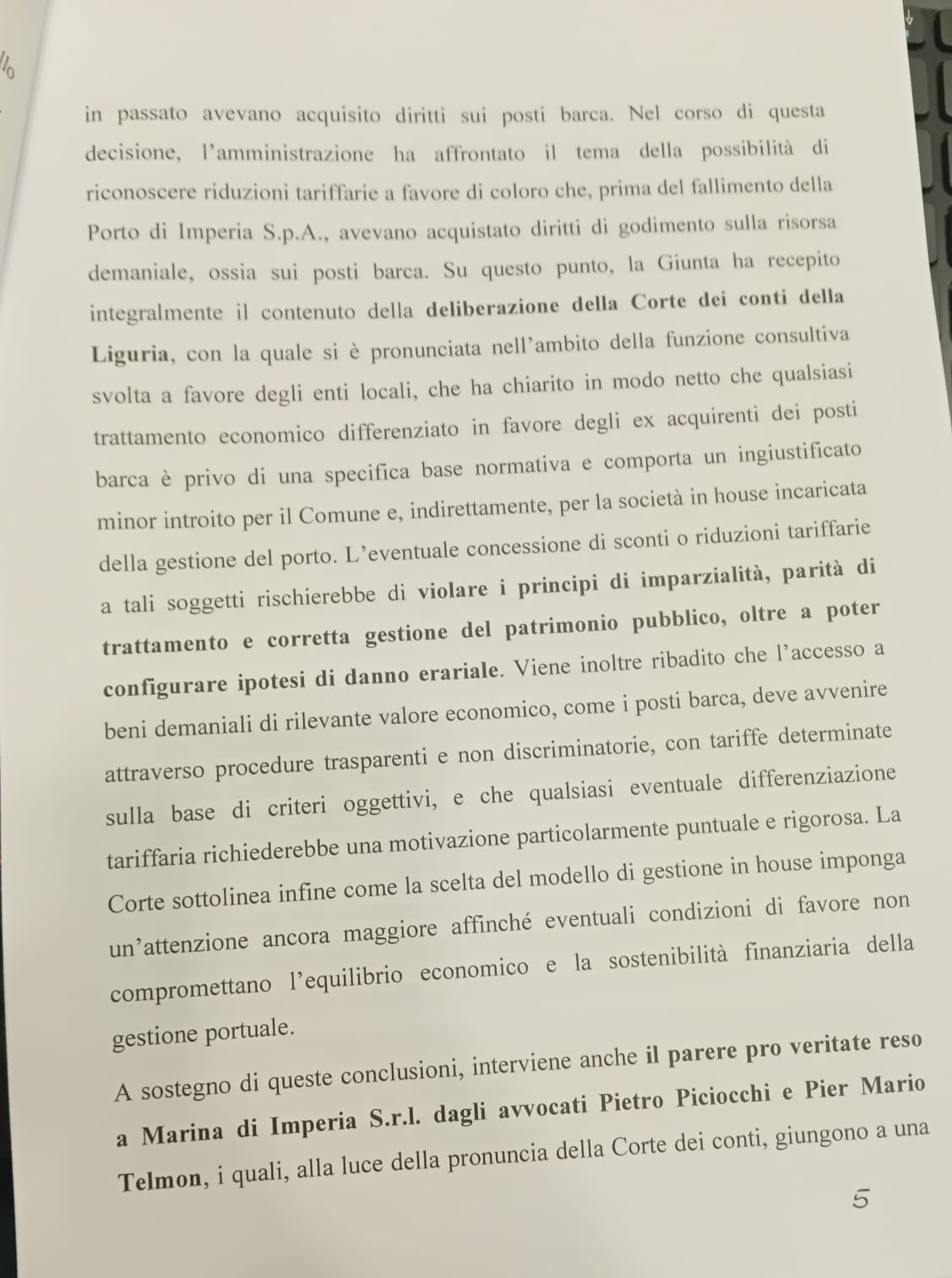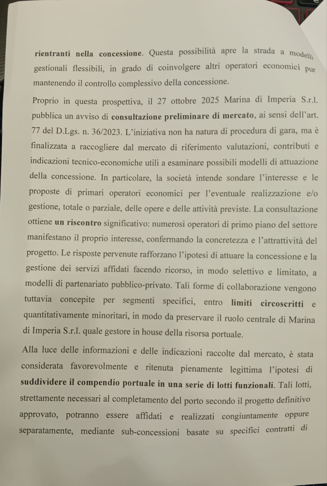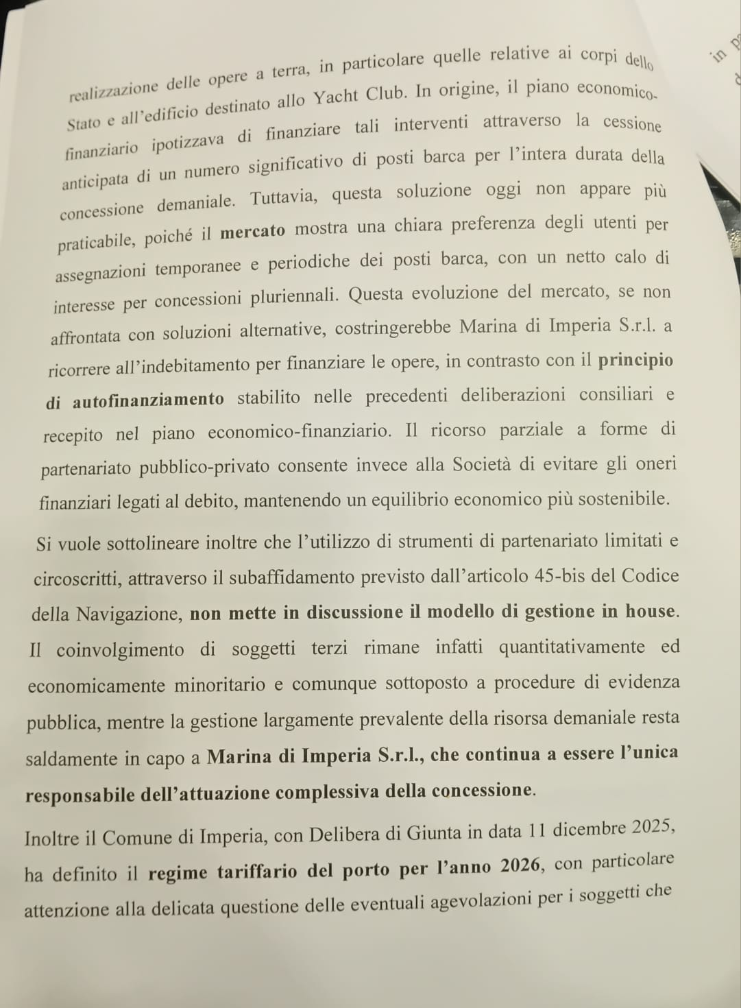 La delibera, ricostruisce il percorso amministrativo degli ultimi vent’anni che ha portato alla concessione alla odierna Marina di Imperia s.r.l., che ha ora l’obiettivo di completare e gestire il porto turistico di Porto Maurizio, includendo infrastrutture portuali, attività commerciali, sportive e servizi per la nautica da diporto.