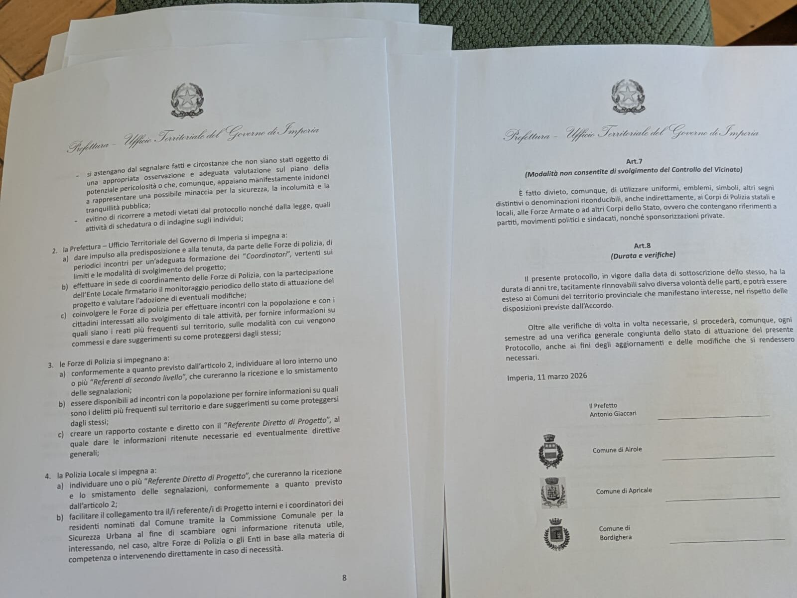La sottoscrizione è avvenuta tra la Prefettura, il Commissario Straordinario al Comune di Bordighera ed i Sindaci del Ponente della provincia: Airole, Apricale, Camporosso, Castelvittorio, Dolceacqua, Isolabona, Olivetta San Michele, Ospedaletti, Perinaldo, Pigna, Rocchetta Nervina, San Biagio della Cima, Seborga, Soldano, Vallebona, Vallecrosia e Ventimiglia.