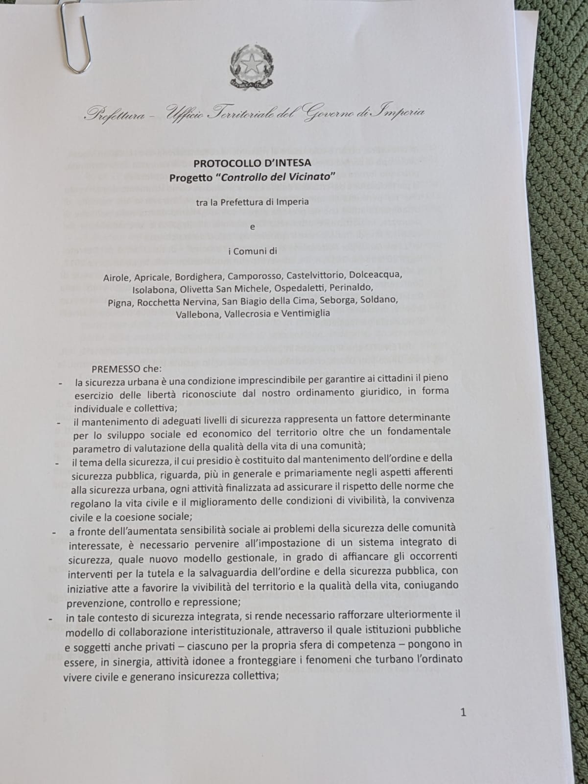 “Il protocollo nasce a seguito dei numerosi furti registratisi nei mesi passati, in particolare nelle aree limitrofe di Camporosso e Bordighera, con l’obiettivo di stimolare una collaborazione attiva e responsabile della cittadinanza nella segnalazione di situazioni potenzialmente pericolose. Il messaggio che vogliamo dare è un messaggio di grande attenzione a questo comprensorio e a questo territorio. Lo scopo è organizzare gli sforzi pubblici e quelli privati a favore del bene sicurezza che deve essere trasversale per tutti. Come auspicio abbiamo quello di estenderlo anche ad altri comuni della provincia“, ha commentato ai nostri microfoni il Prefetto Antonio Giaccari