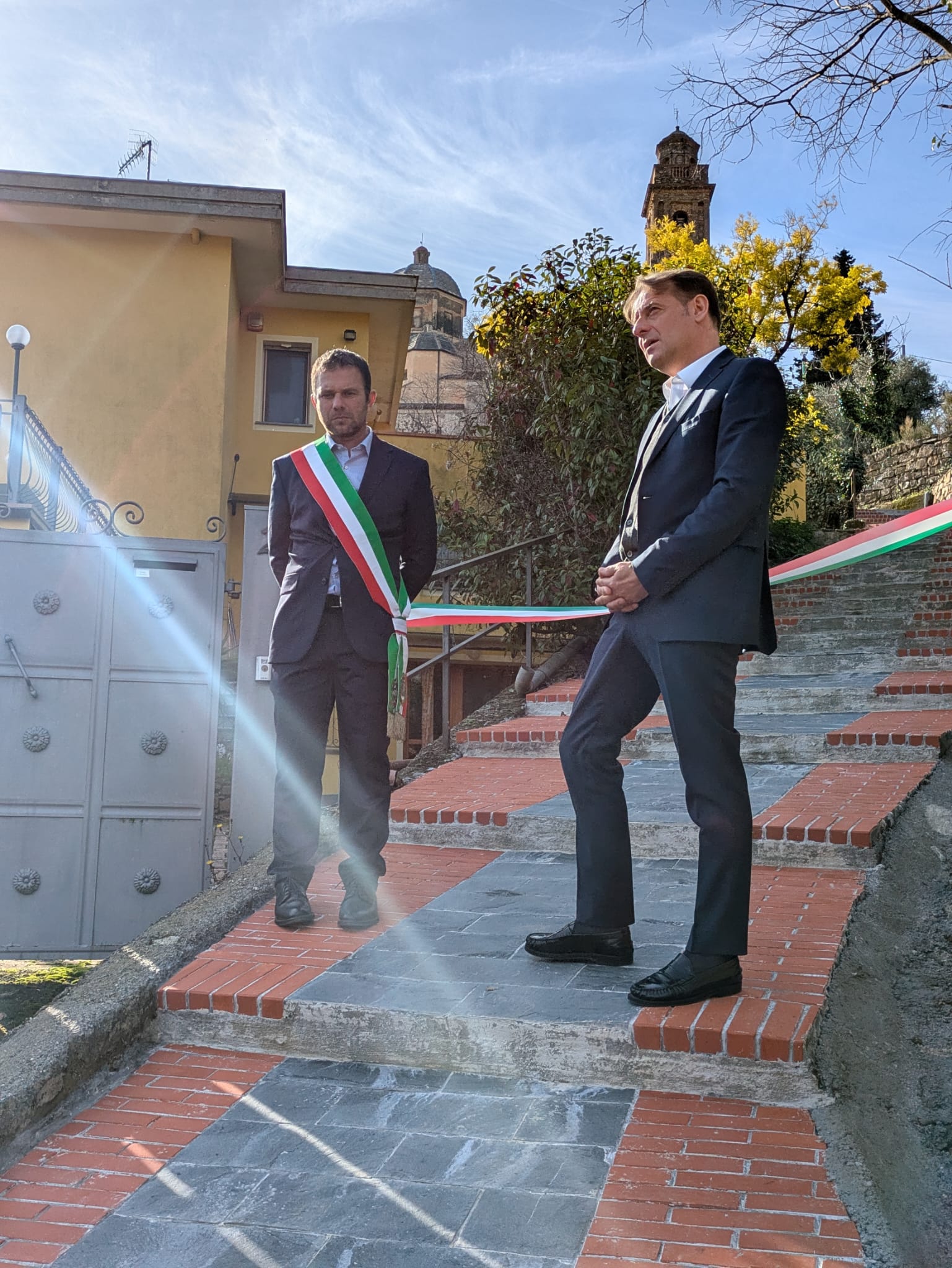 Inaugurato questa mattina l’intervento di riqualificazione dei collegamenti pedonali tra le borgate Ascheri e Villa Chiesa di Diano Arentino, un’opera pensata per restituire centralità e sicurezza ai percorsi storici del paese alla presenza del sindaco Paolo Sciandino e l’assessore regionale alla Rigenerazione urbana Marco Scajola. Presenti inoltre gli amministratori comunali del Golfo Dianese.