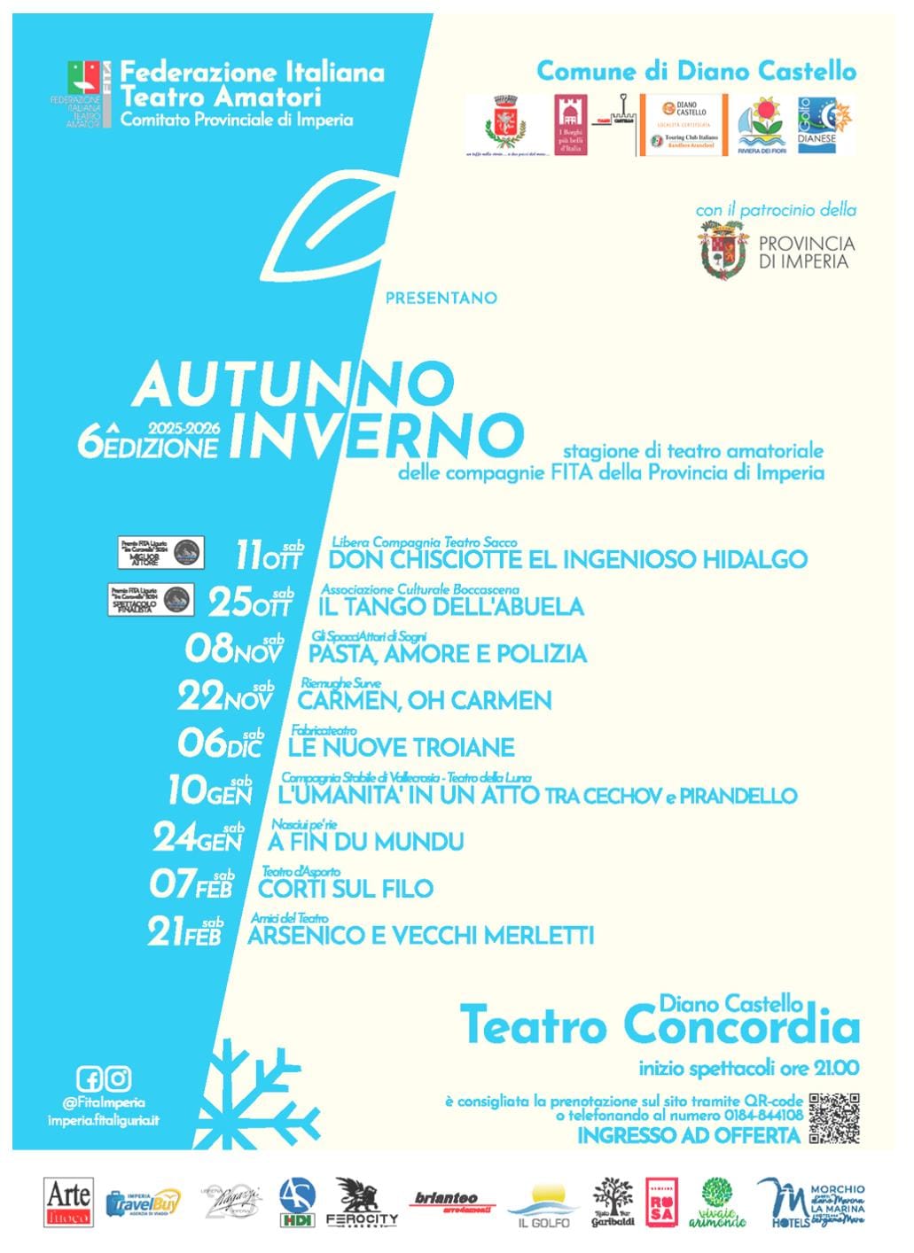 Si è svolta questo pomeriggio al Teatro Concordia di Diano Castello la conferenza stampa di presentazione della sesta edizione di Autunno/Inverno, stagione di Teatro Amatoriale 2025-26, organizzata con le compagnie affiliate FITA (Federazione Italiana Teatro Amatori) e con il patrocinio della Provincia di Imperia.