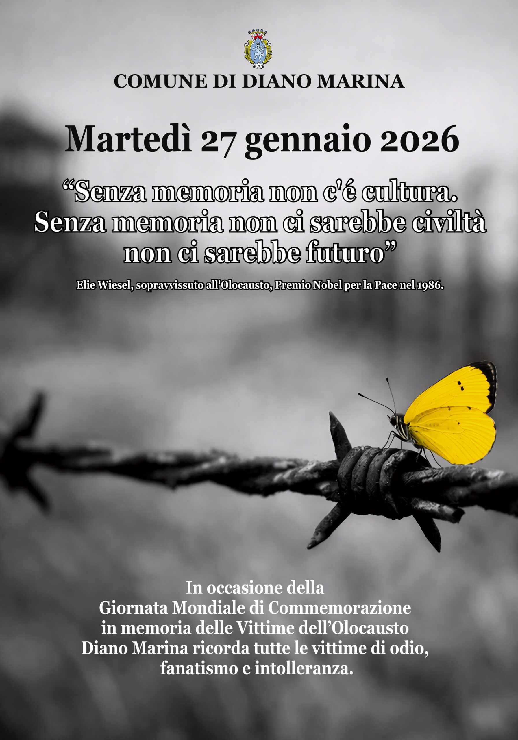 I manifesti, esposti in diversi punti della città, presentano un’immagine di grande potenza evocativa: la farfalla gialla che si posa sul filo spinato. Questo simbolo, che unisce la fragilità della vita alla resistenza dello spirito umano, fa da sfondo a una citazione di Elie Wiesel, sopravvissuto all’Olocausto e Premio Nobel per la Pace nel 1986: “Senza memoria non c’è cultura. Senza memoria non ci sarebbe civiltà, non ci sarebbe futuro”.