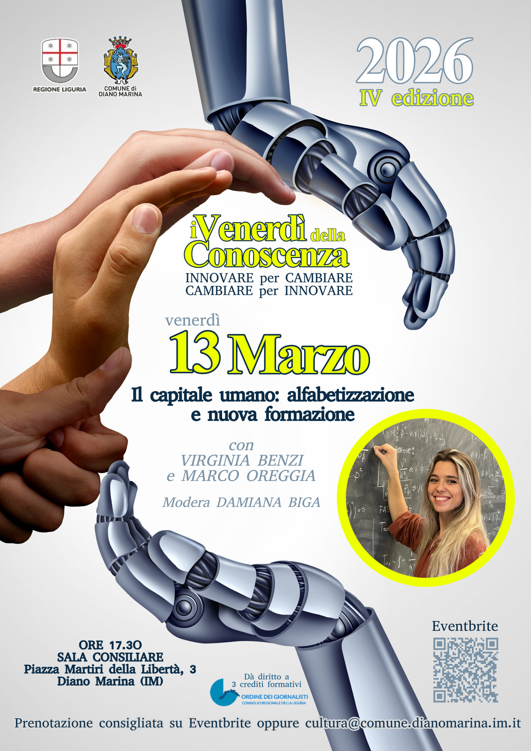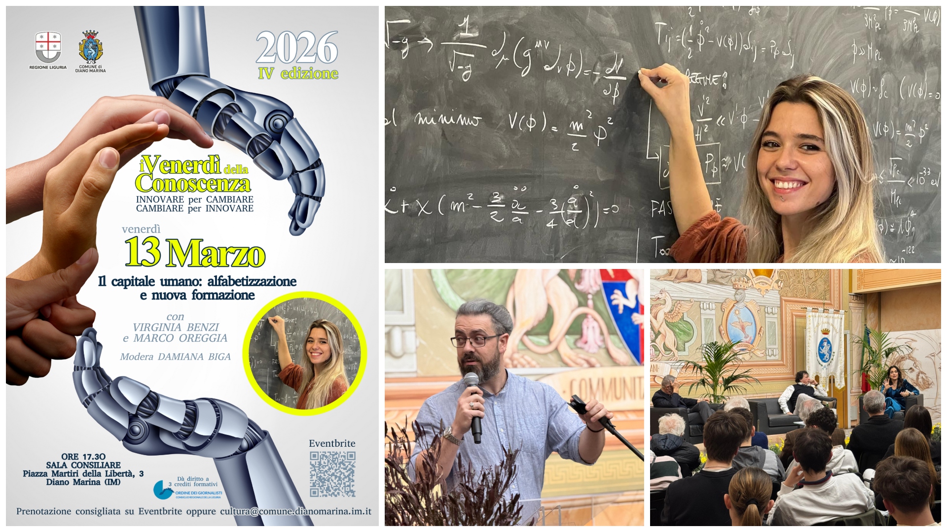 Venerdì 13 marzo 2026, alle ore 17:30 presso la Sala consiliare del Comune di Diano Marina, il ciclo di conferenze ‘i Venerdì della Conoscenza‘ giunge al suo quarto incontro stagionale, affrontando un tema di stringente attualità: ‘Il capitale umano: alfabetizzazione e nuova formazione‘. Con il patrocinio della Regione Liguria, la presenza di relatori di rilievo e la partecipazione attiva di studenti, insegnanti, autorità, giornalisti e un numeroso e interessato pubblico, l’evento si conferma come un punto di riferimento culturale particolarmente significativo per la provincia di Imperia e non solo. Filo conduttore di questa edizione, il tema ‘Cambiare per innovare, innovare per cambiare‘.
