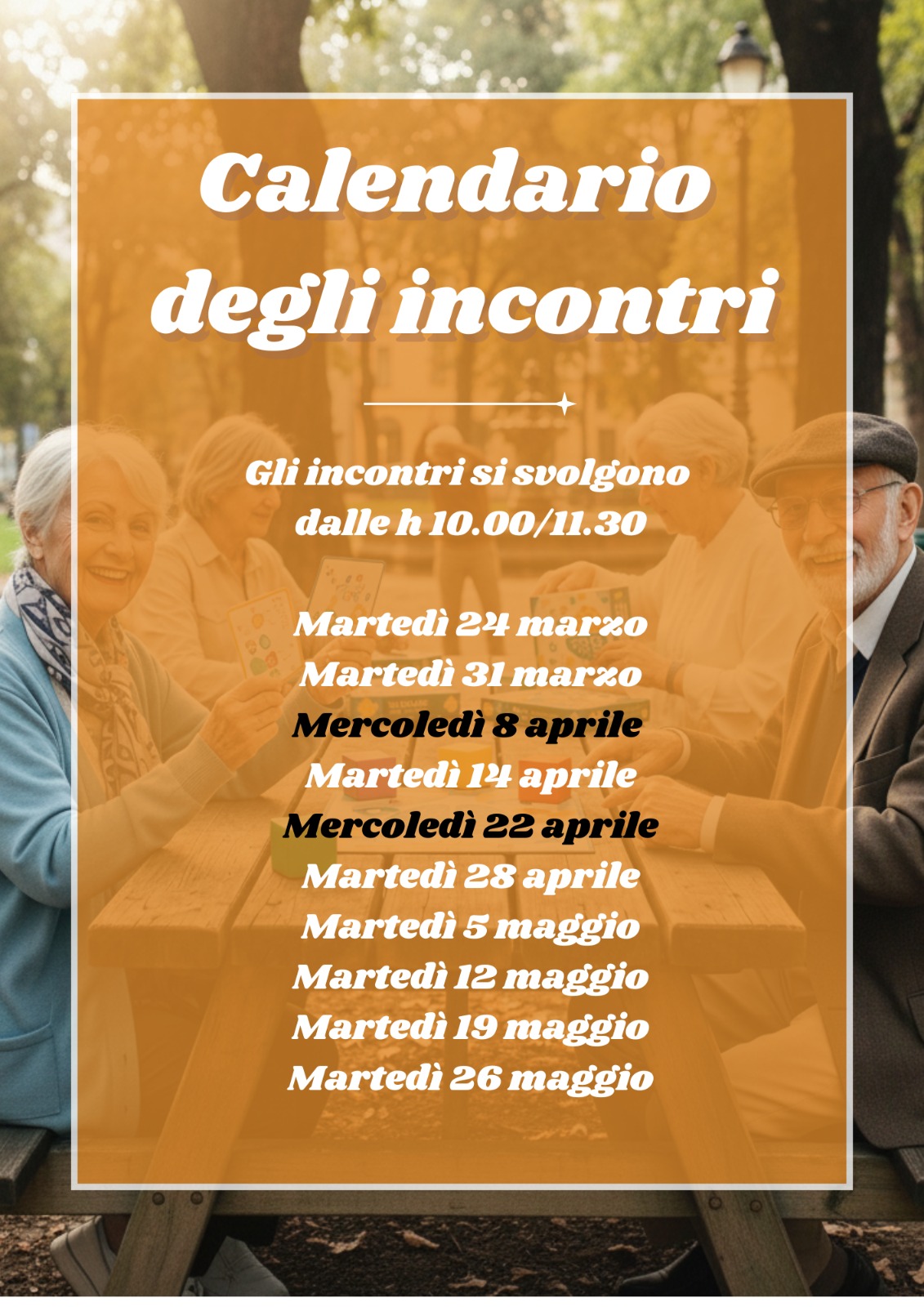 Gli incontri si terranno presso il Centro Sociale Ada Carlotta Garibaldi, in via Genova 27 a Diano Marina, con cadenza settimanale, dalle 10:00 alle 11:30. L’inizio è previsto per il 24 marzo, con un calendario che si estenderà fino a martedì 26 maggio.