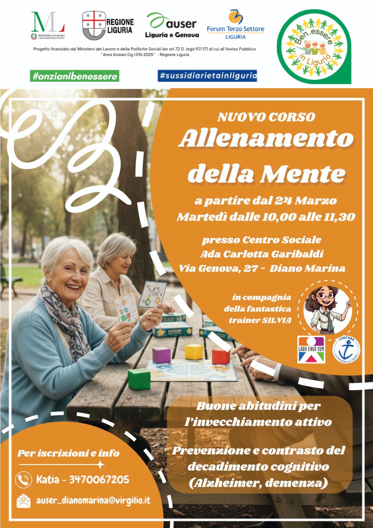 Prende il via a Diano Marina un’importante iniziativa dedicata al benessere della terza età : il nuovo corso di “Allenamento della Mente“. Promosso da Auser Liguria e Genova, in collaborazione con Regione Liguria, Forum Terzo Settore Liguria, Ben.essere in Liguria, L’Ancora e Ludo Ergo Sum, il progetto mira a sostenere l’invecchiamento attivo e a contrastare il decadimento cognitivo.