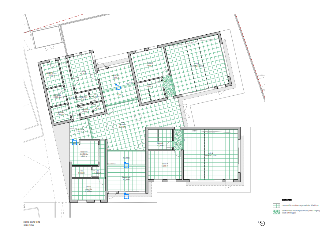 Le finiture interne sono oggetto di alcuni adeguamenti mirati. Nel locale tecnico la pavimentazione e gli zoccolini in PVC vengono sostituiti con materiali in gres, più resistenti e adatti a un utilizzo intensivo. Nelle restanti aree dell’edificio, invece, gli zoccolini in PVC lasciano spazio a zoccolini in legno tinteggiabile, più coerenti con le scelte estetiche complessive. Sono inoltre previste velette e modifiche ai controsoffitti per risolvere interferenze di tipo strutturale e impiantistico in diversi ambienti, mentre nelle zone di ingresso alle aule i controsoffitti modulari vengono sostituiti con soluzioni lisce, dal maggiore impatto visivo e funzionale.