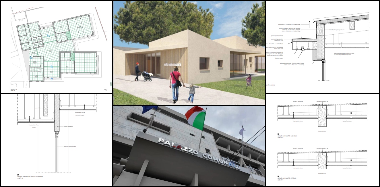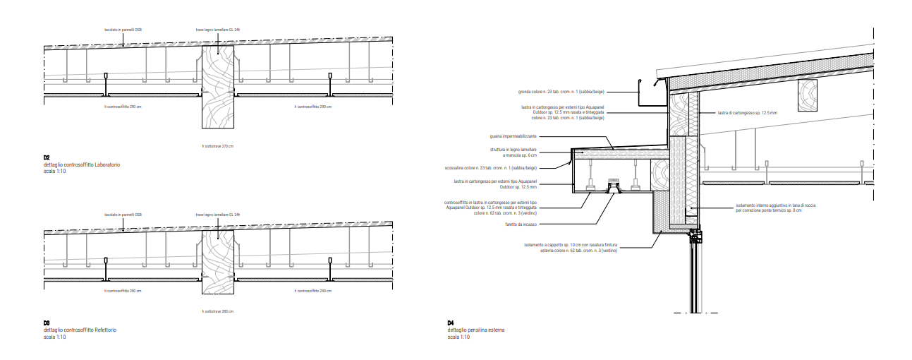 Infine, le pensiline esterne sono oggetto di modifiche di carattere tecnico-costruttivo, con interventi su scossaline, intradossi e isolamento. Gli adeguamenti consentono di migliorare le prestazioni termiche complessive e di risolvere alcune criticità emerse in fase esecutiva.