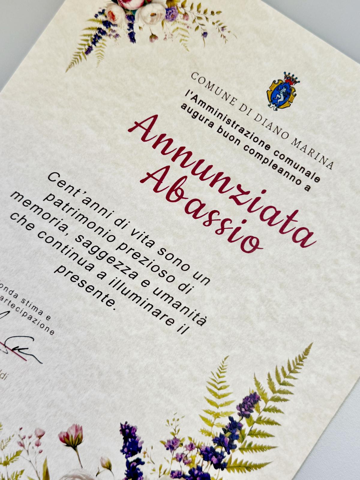 “La sua presenza nel nostro territorio rappresenta per la comunità dianese un motivo di arricchimento umano e culturale – ha dichiara il sindaco Cristiano Za Garibaldi – I cento anni che celebra oggi sono testimonianza di una lunga vita attraversata con dignità, esperienza e memoria, valori che meritano rispetto e riconoscenza”.