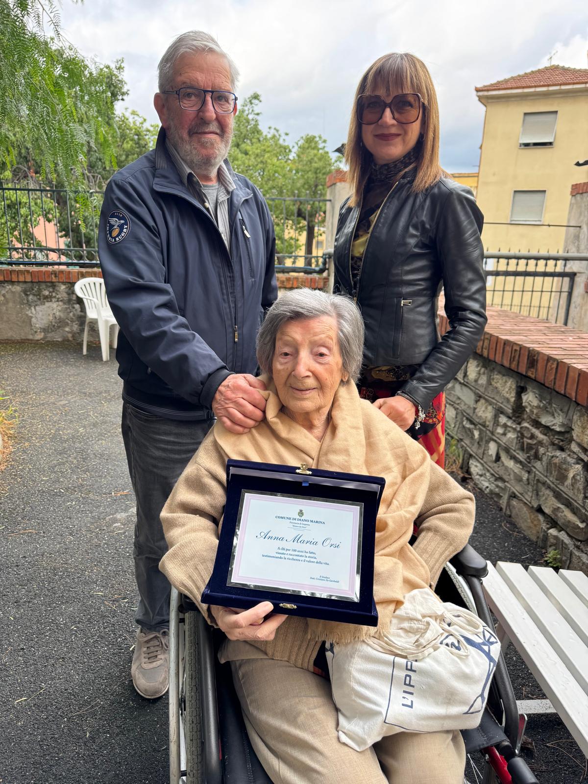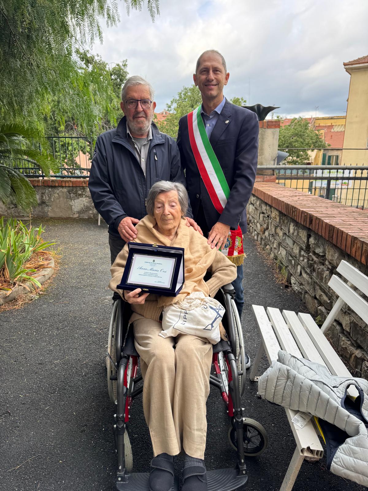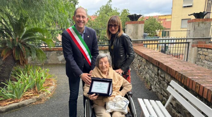 In occasione di questo importante traguardo, il Comune di Diano Marina ha voluto consegnarle una targa commemorativa, come segno di affetto e riconoscenza da parte di tutta la cittadinanza. Alla consegna della targa – con il sindaco Cristiano Za Garibaldi e l’assessore Sabrina Messico – era presente anche il figlio Stefano.