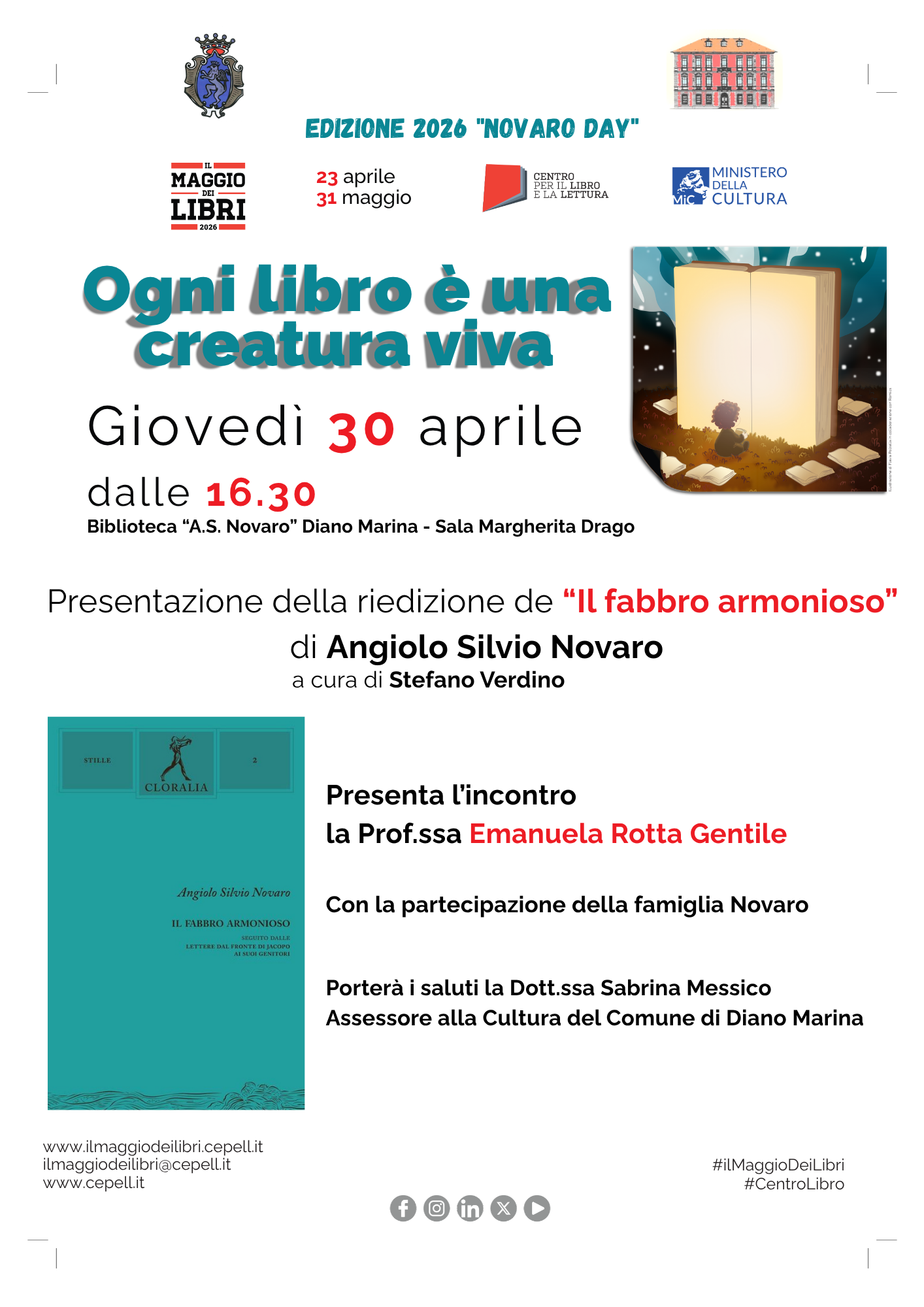 L’assessore alla cultura del Comune di Diano Marina, Sabrina Messico, ha aggiunto: “Il Maggio dei Libri è un’opportunità straordinaria per la nostra comunità di riavvicinarsi al piacere della lettura e di riscoprire i tesori letterari legati al nostro territorio. La riedizione de ‘Il fabbro armonioso’ di Angiolo Silvio Novaro è un punto di partenza ideale, un ponte tra passato e presente che valorizza la nostra identità culturale e offre spunti di riflessione sempre attuali”.