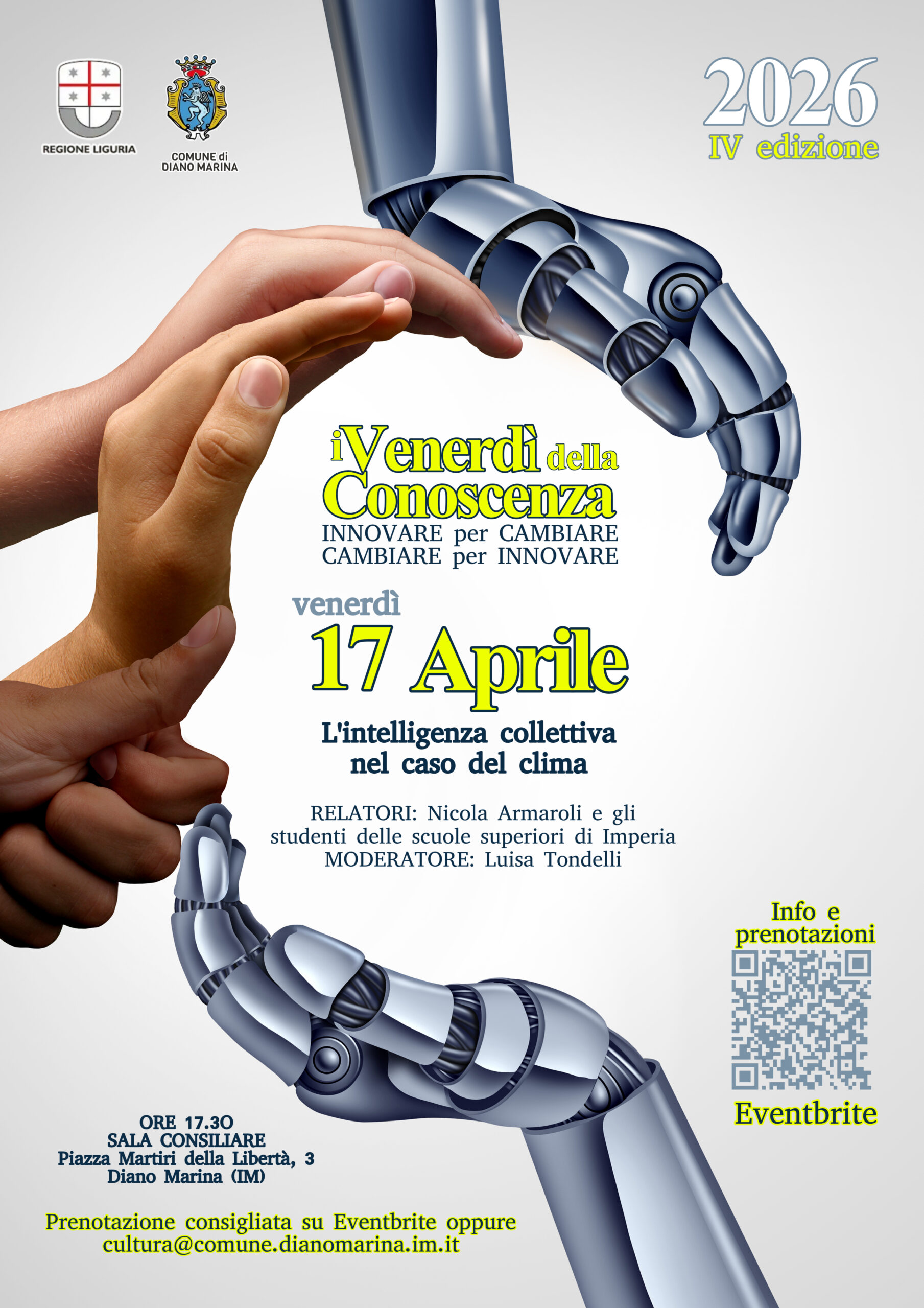 L’appuntamento è fissato per venerdì 17 aprile alle ore 17.30 nella sala consiliare del Comune di Diano Marina, al secondo piano di piazza Martiri della Libertà 3. Il titolo della conferenza è “L’intelligenza collettiva nel caso del clima”.