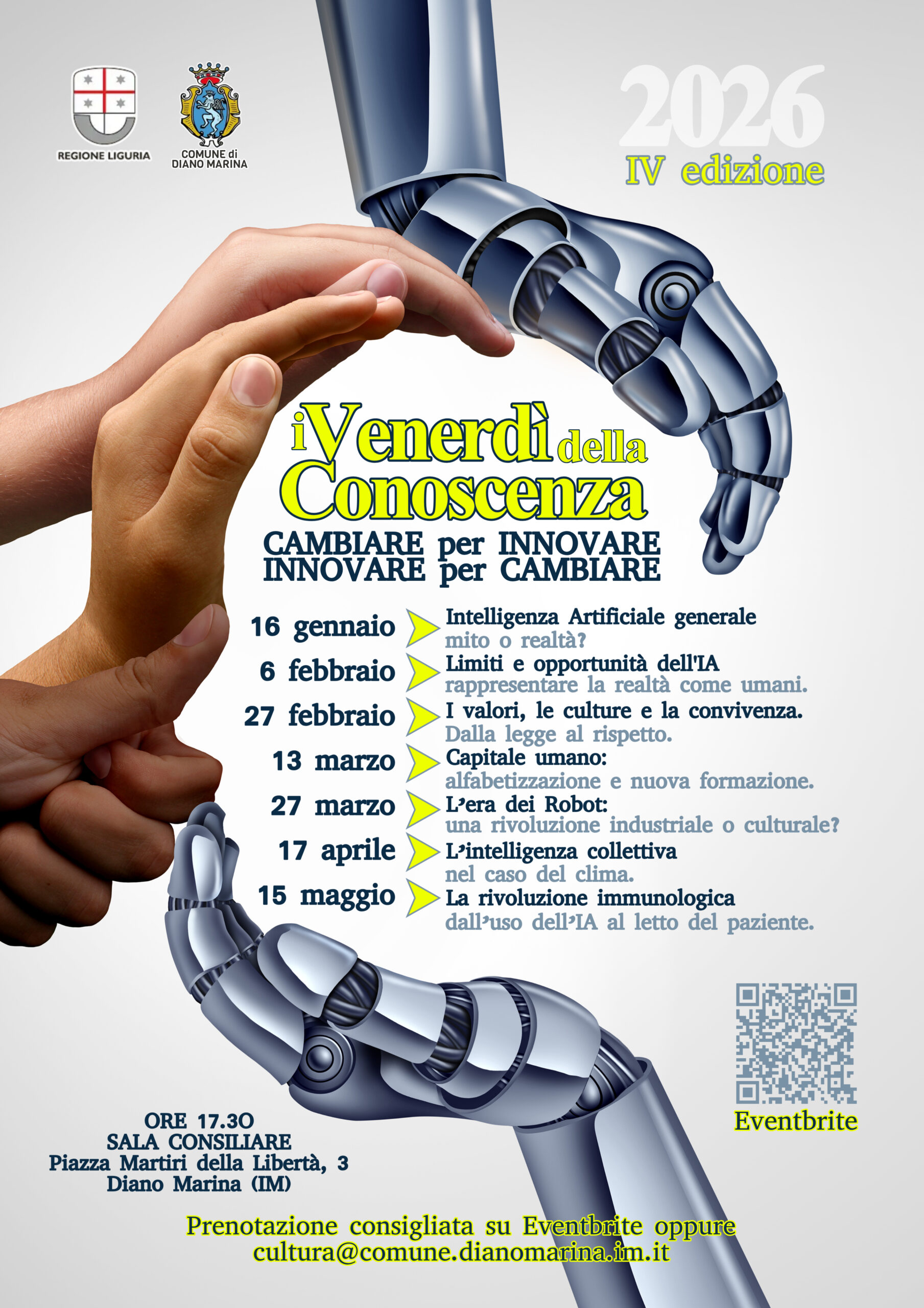 Gli incontri de “I Venerdì della Conoscenza” si svolgono in presenza presso la sala consiliare del Comune di Diano Marina. Data la capienza limitata della sala consiliare, si raccomanda la prenotazione. È possibile confermare la propria presenza tramite e-mail: cultura@comune.dianomarina.im.it e su Eventbrite: https://www.eventbrite.it/cc/i-venerdi-della-conoscenza-2026-4799752. I giornalisti interessati a seguire l’evento e a ottenere crediti formativi potranno registrarsi attraverso la piattaforma di formazione obbligatoria continua.