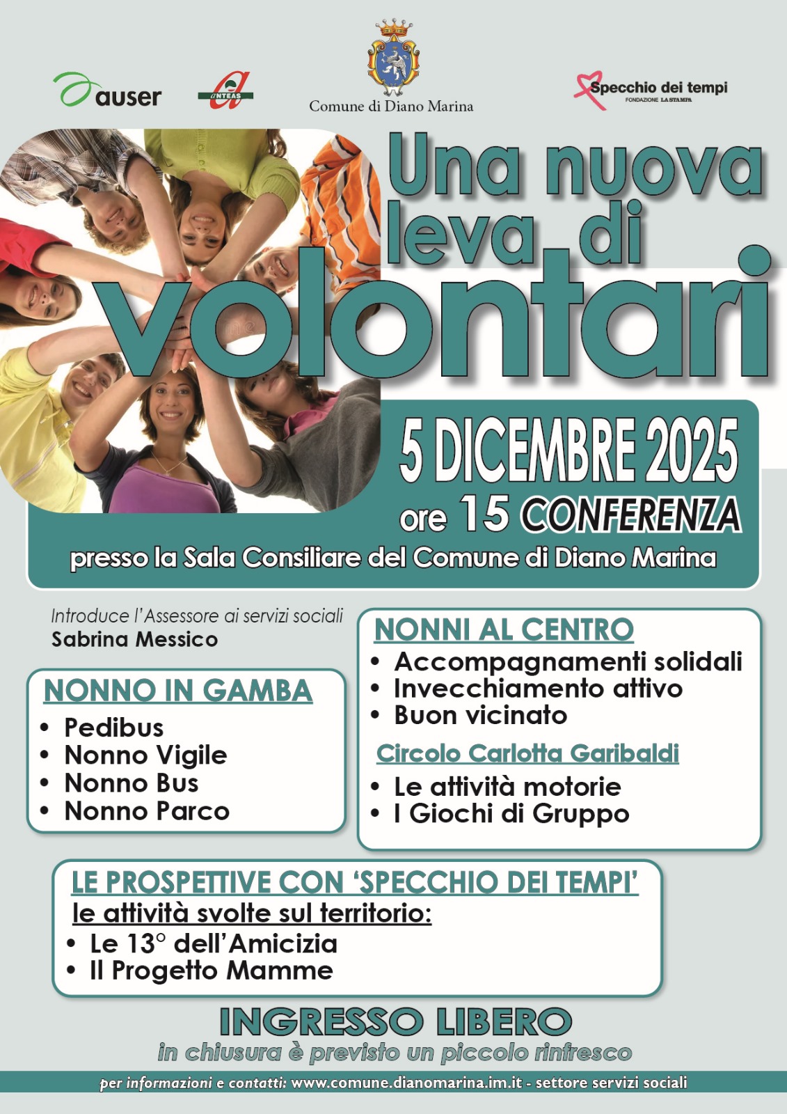 Il Comune di Diano Marina, in collaborazione con le associazioni Auser e Anteas e con il sostegno della fondazione “Specchio dei Tempi” de La Stampa, Ăš lieto di annunciare l’evento “Una nuova leva di volontari“. L’iniziativa si terrĂ venerdĂŹ 5 dicembre 2025 alle ore 15:00 presso la sala consiliare del Comune e mira a rafforzare la rete di volontariato locale, fondamentale per il tessuto sociale della cittĂ .