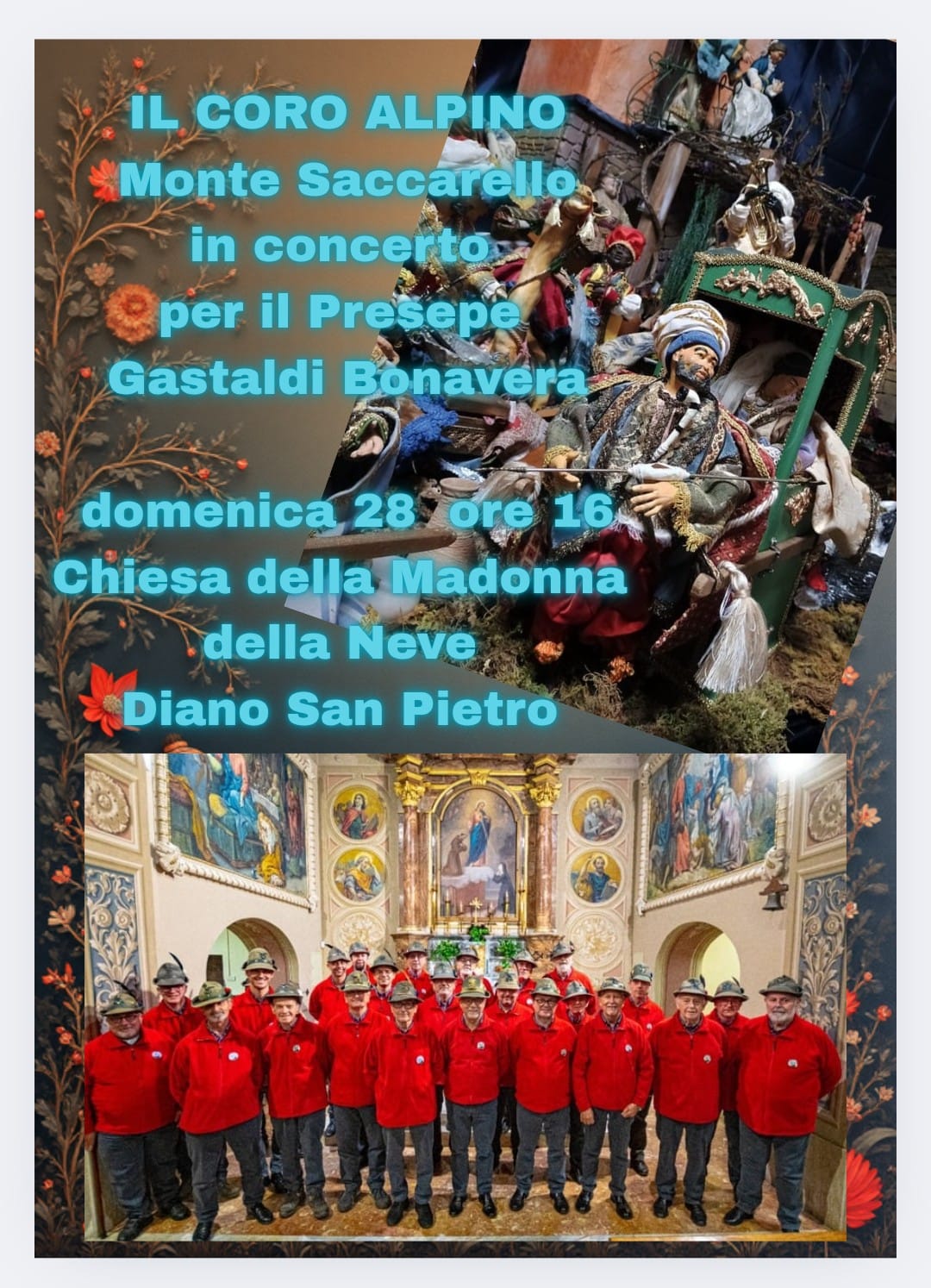 Domenica 28 dicembre, a partire dalle ore 16, le visite al presepe saranno arricchite dai canti del Coro Alpino Monte Saccarello. Il gruppo, legato da anni alla comunità locale, eseguirà una selezione di brani del proprio repertorio all’interno della suggestiva cornice del Santuario della Madonna della Neve.