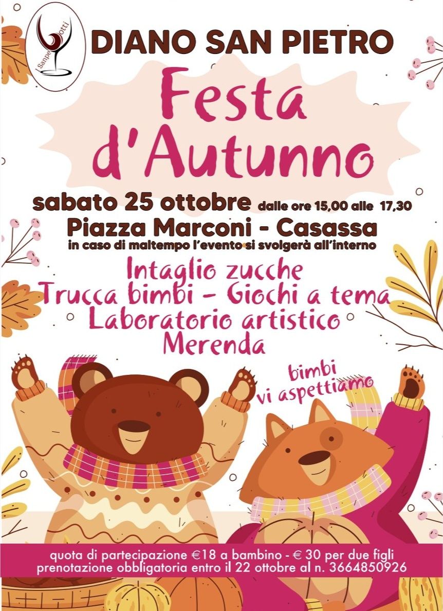 Sabato 25 ottobre, dalle 15:00 alle 17:30, il cortile della Casassa a Diano San Pietro si trasformerà in un regno dell’autunno con la Festa dei Sanpegotti. Una giornata dedicata ai più piccoli, ma anche alle famiglie, all’insegna del divertimento, della creatività e delle zucche.