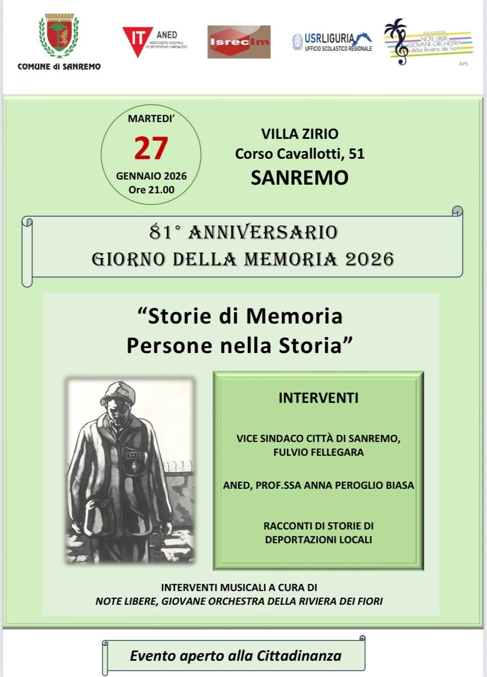 Sono previsti i contributi del vice sindaco di Sanremo, Fulvio Fellegara, e della prof.ssa Anna Peroglio Biasia (ANED), con racconti dedicati alle storie di deportazioni locali.