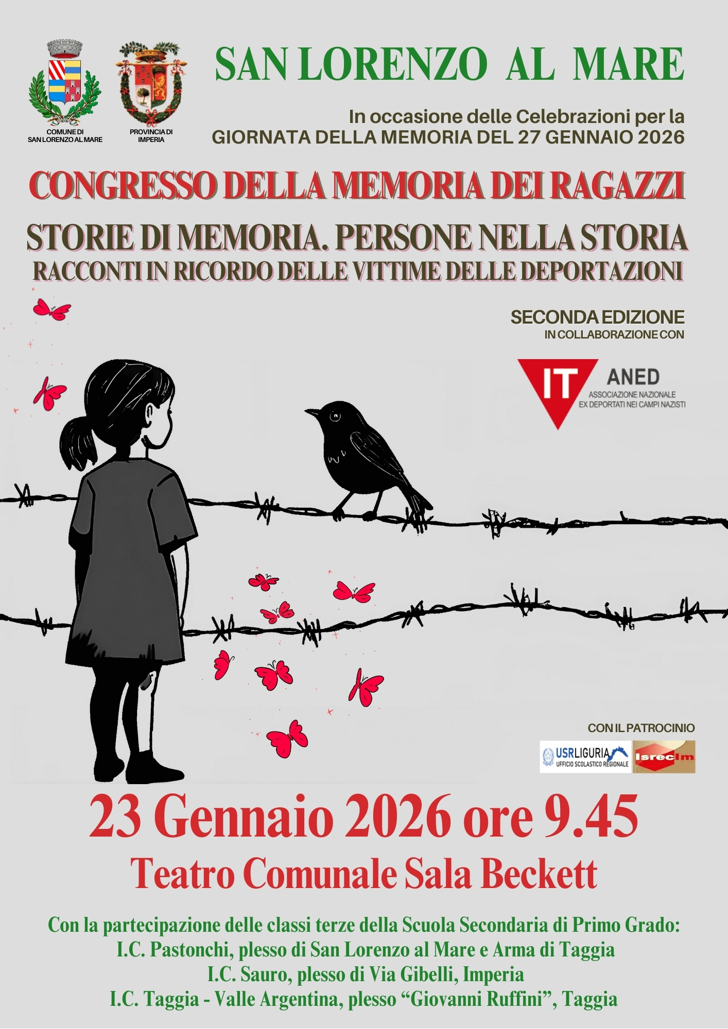 - Venerdì 23 gennaio, ore 9:45 – Congresso della Memoria dei Ragazzi: un incontro dedicato alle classi terze della Scuola Secondaria di Primo Grado degli istituti I.C. Pastonchi (San Lorenzo e Arma di Taggia), I.C. Sauro (Imperia) e I.C. Taggia (plesso “Giovanni Ruffini”).