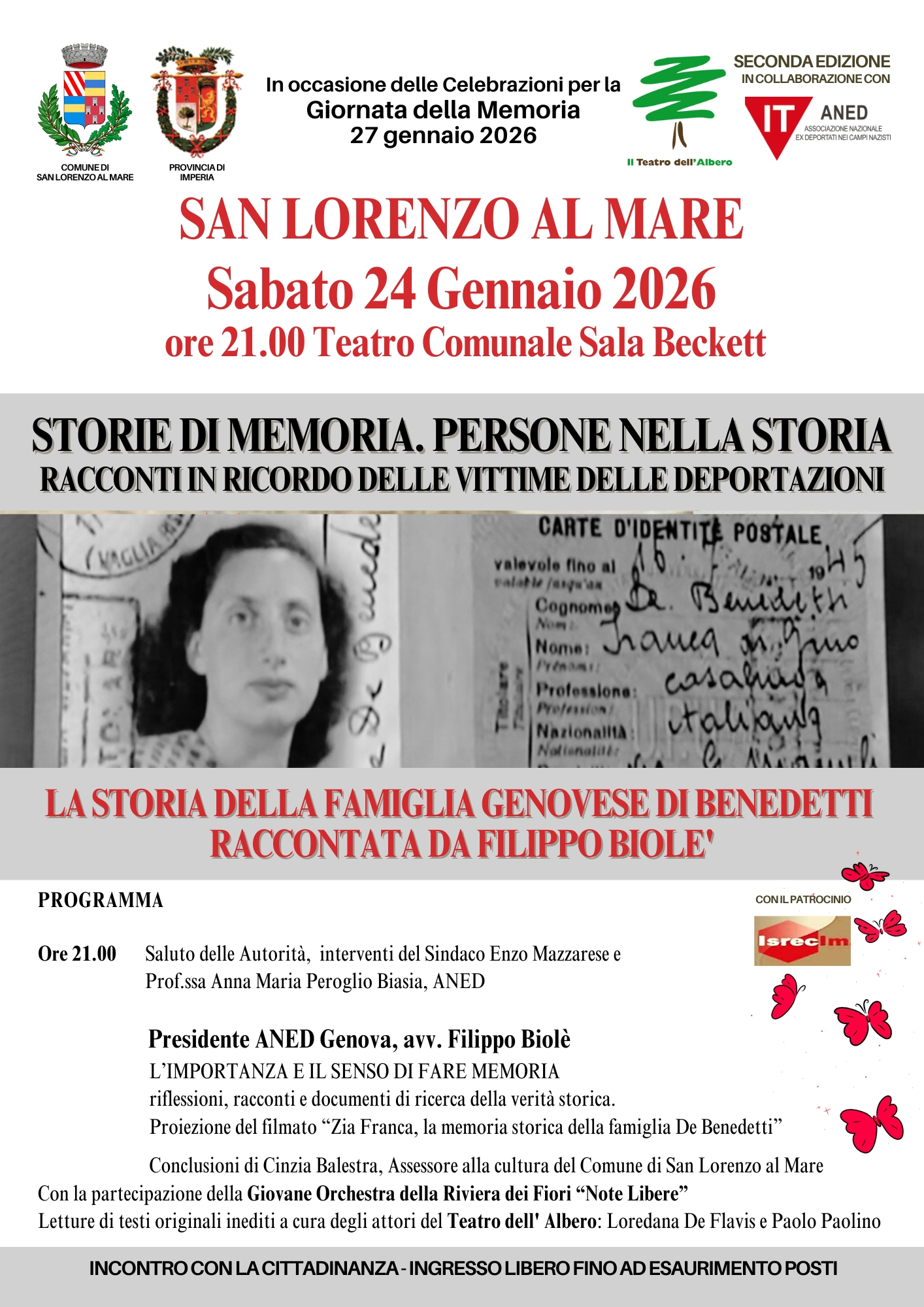- Sabato 24 gennaio, ore 21:00 – Incontro con la cittadinanza: serata dedicata alla storia della famiglia genovese De Benedetti raccontata da Filippo Biolè. Interverranno il sindaco Enzo Mazzarese, la prof.ssa Anna Maria Peroglio Biasia e l’avv. Filippo Biolè, presidente ANED Genova. L’evento sarà arricchito dalle letture a cura degli attori del Teatro dell’Albero (Loredana De Flavis e Paolo Paolino) e dalla partecipazione della Giovane Orchestra della Riviera dei Fiori “Note Libere”.
