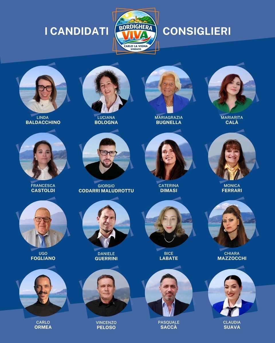Di seguito l’elenco dei candidati consiglieri per la lista “Bordighera Viva – Carlo La Vigna Sindaco”: Linda Baldacchino, Luciana Bologna, Mariagrazia Bugnella, Mariarita Calà, Francesca Castoldi, Giorgio Codarri Maludrottu, Caterina Dimasi, Monica Ferrari, Ugo Fogliano, Daniele Guerrini, Bice Labate, Chiara Mazzocchi, Carlo Ormea, Vincenzo Peloso, Pasquale Saccà, Claudia Suava.