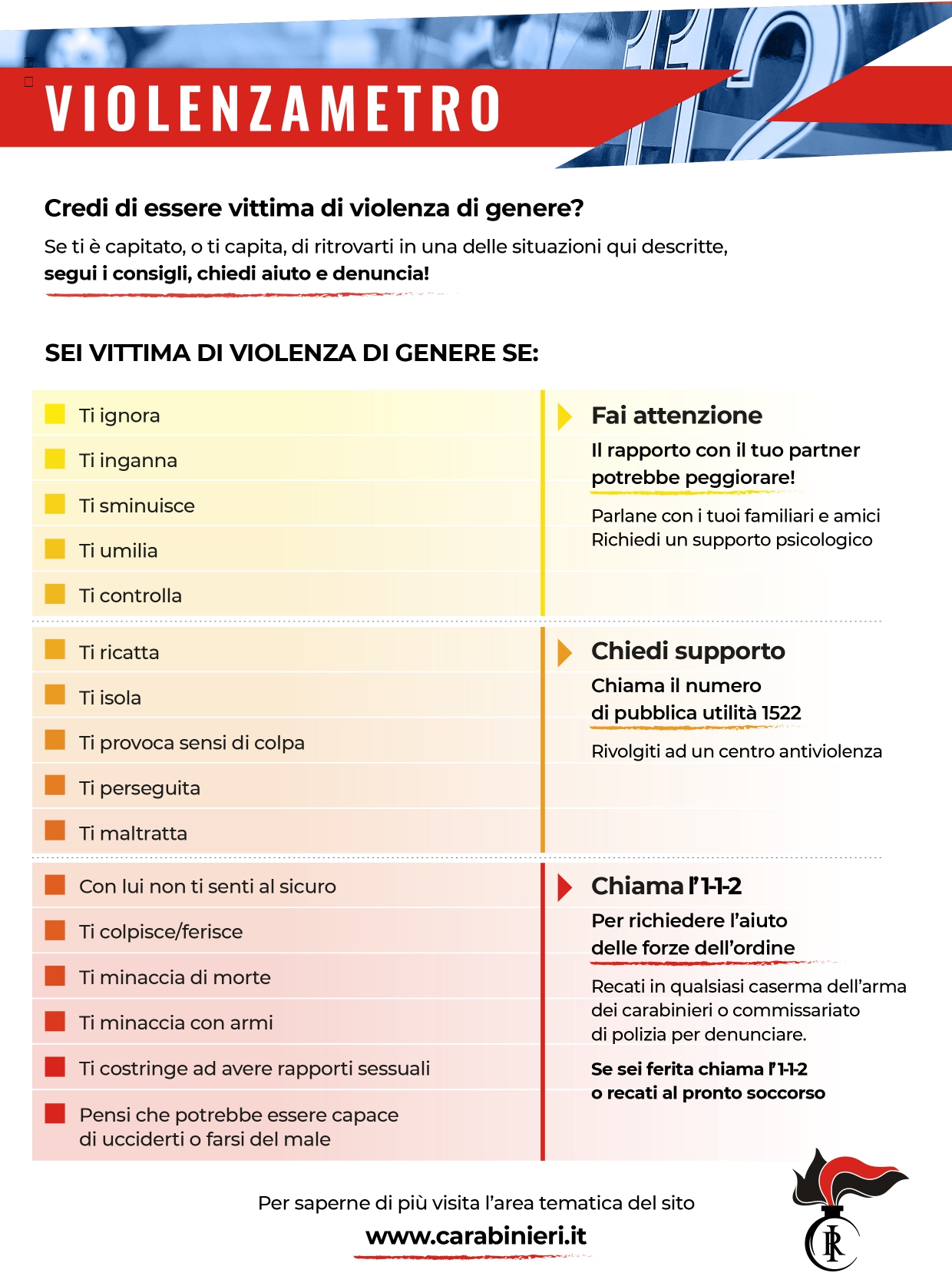 Inoltre, sul sito www.carabinieri.it ù stata dedicata un’intera sezione al “Codice Rosso”, che offre informazioni sul fenomeno e sugli strumenti di tutela delle vittime, mettendo a disposizione un test di autovalutazione, denominato “Violenzametro”, che rileva il livello di violenza subita in un rapporto di coppia.