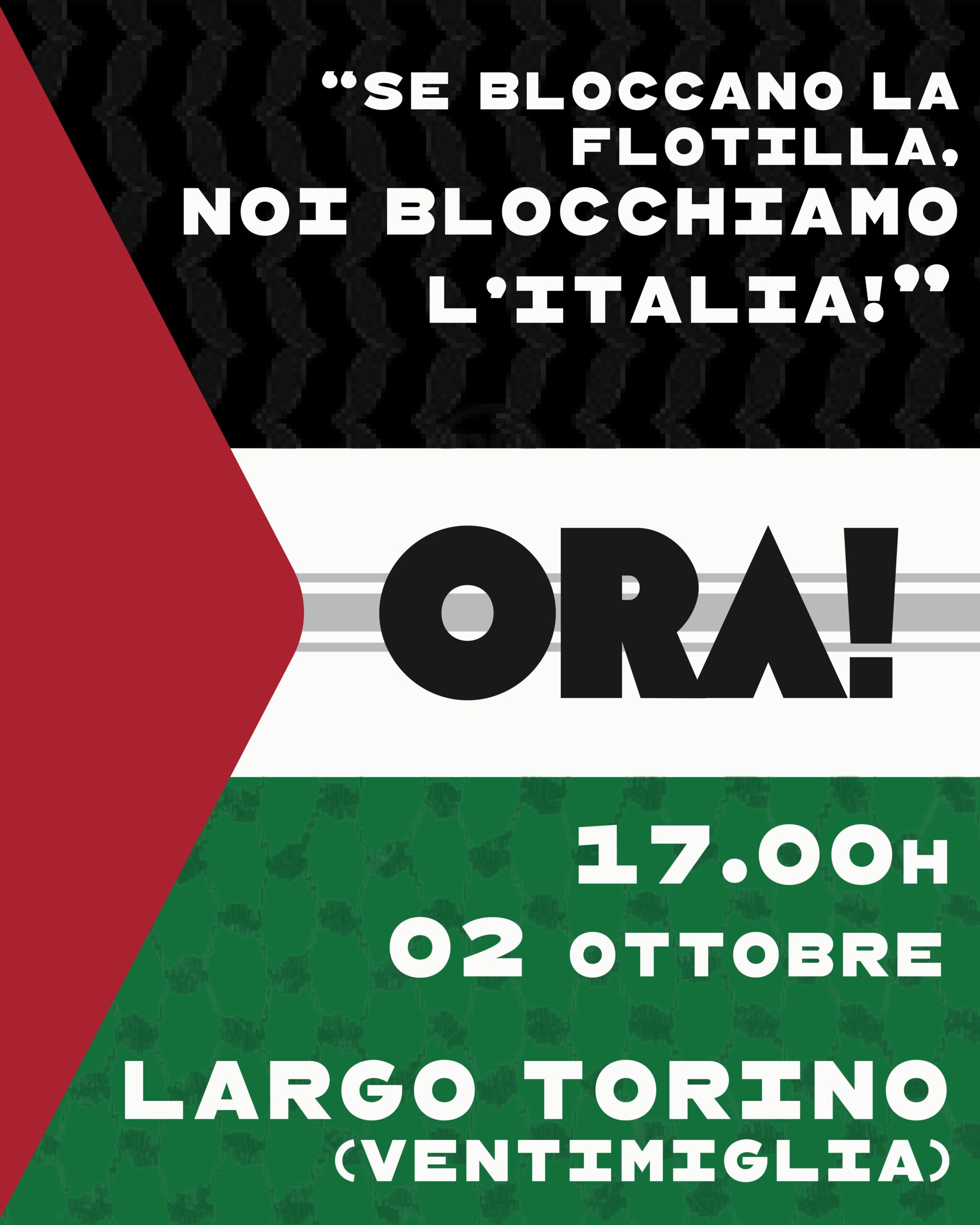 Oggi, 2 ottobre 2025, alle ore 17 saremo presso largo Torino a Ventimiglia, perché Israele tolga le mani dalla flotilla e da un popolo schiacciato da 75 anni di occupazione.