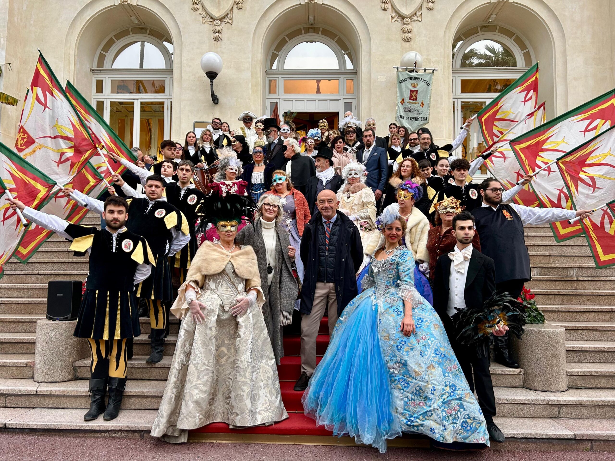 Partita all’ombra della ‘Primavera’ di corso Imperatrice, la corte in maschera, accompagnata dagli sbandieratori di Ventimiglia, hanno sfilato fino a sotto il Casinò.