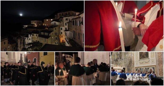 Dopo di che la musica prende nuovamente la scena, sostituendo i corni del giorno al canto delle 4 confraternite: i Rossi di Santa Caterina, gli Azzurri della Visitazione, i Verdi di Santa Marta e i Neri della Misericordia, che in ordine prestabilito si dispongono secondo un ordine consolidato e in abiti tradizionali, partecipano alla liturgia con una processione, intonando ‘a cappella’ i canti tradizionali, fra i Miserere, lo Stabat Mater e le laudi penitenziali, prima in prossimità della piazza, poi davanti all’altare, e infine sulla via del ritorno alla propria chiesa, muniti di candele nell’oscurità dei vicoli o alla luce pallida della luna come quest’anno.
